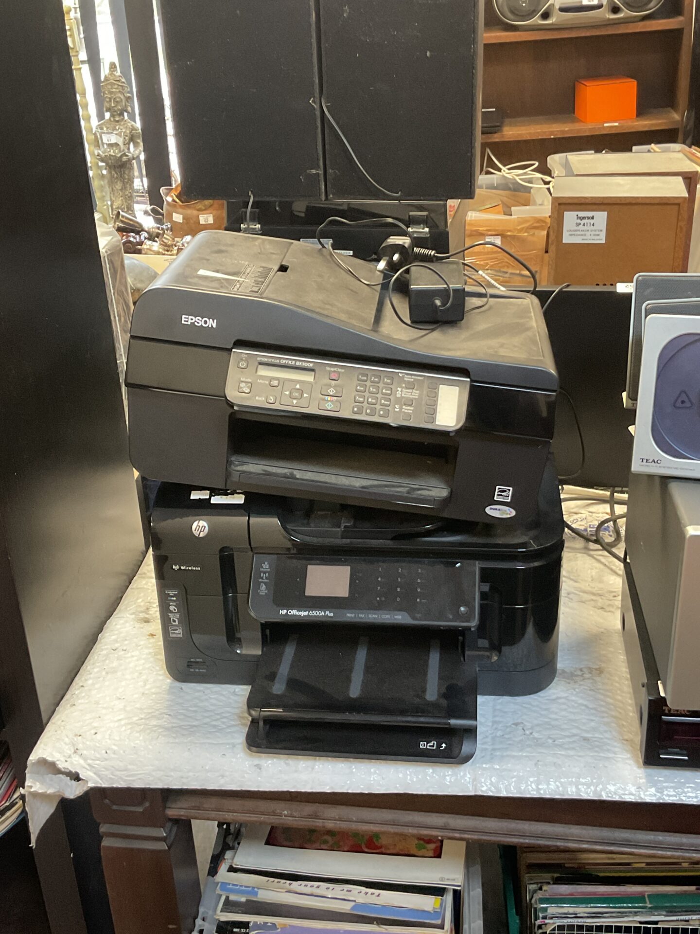 This lot features two office printers: an Epson BX300F and an HP Officejet 6500A Plus. The Epson BX300F is a versatile all-in-one inkjet printer, scanner, and copier, ideal for home or small office use. The HP Officejet 6500A Plus is another multifunction printer offering printing, scanning, and copying capabilities, known for its reliable performance and ease of use.