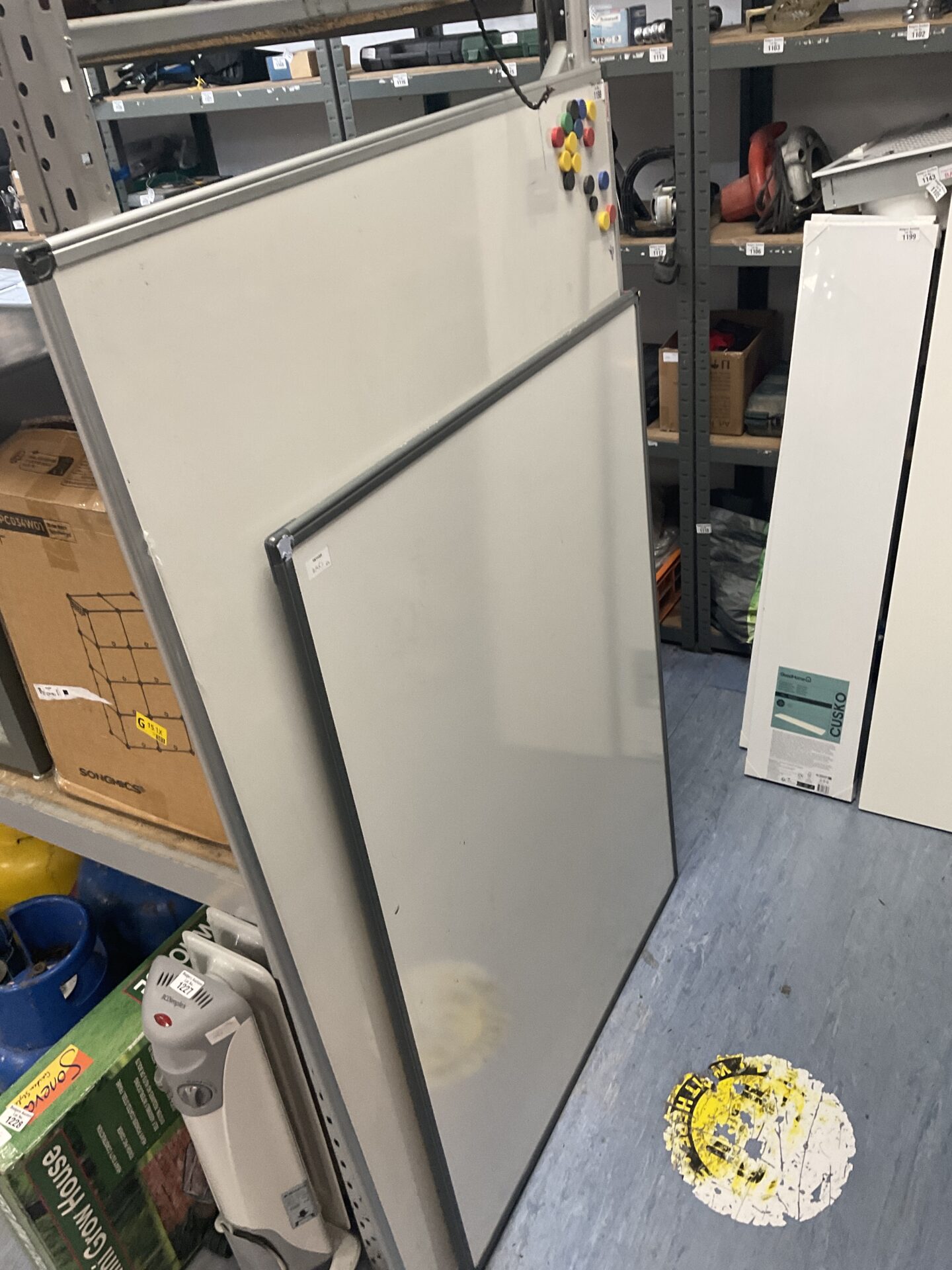 These are two large office whiteboards, designed for use in professional or educational settings. The whiteboards feature a smooth, white surface ideal for writing and drawing with dry-erase markers. Their size makes them suitable for presentations, brainstorming sessions, or as a central communication hub in an office or classroom.