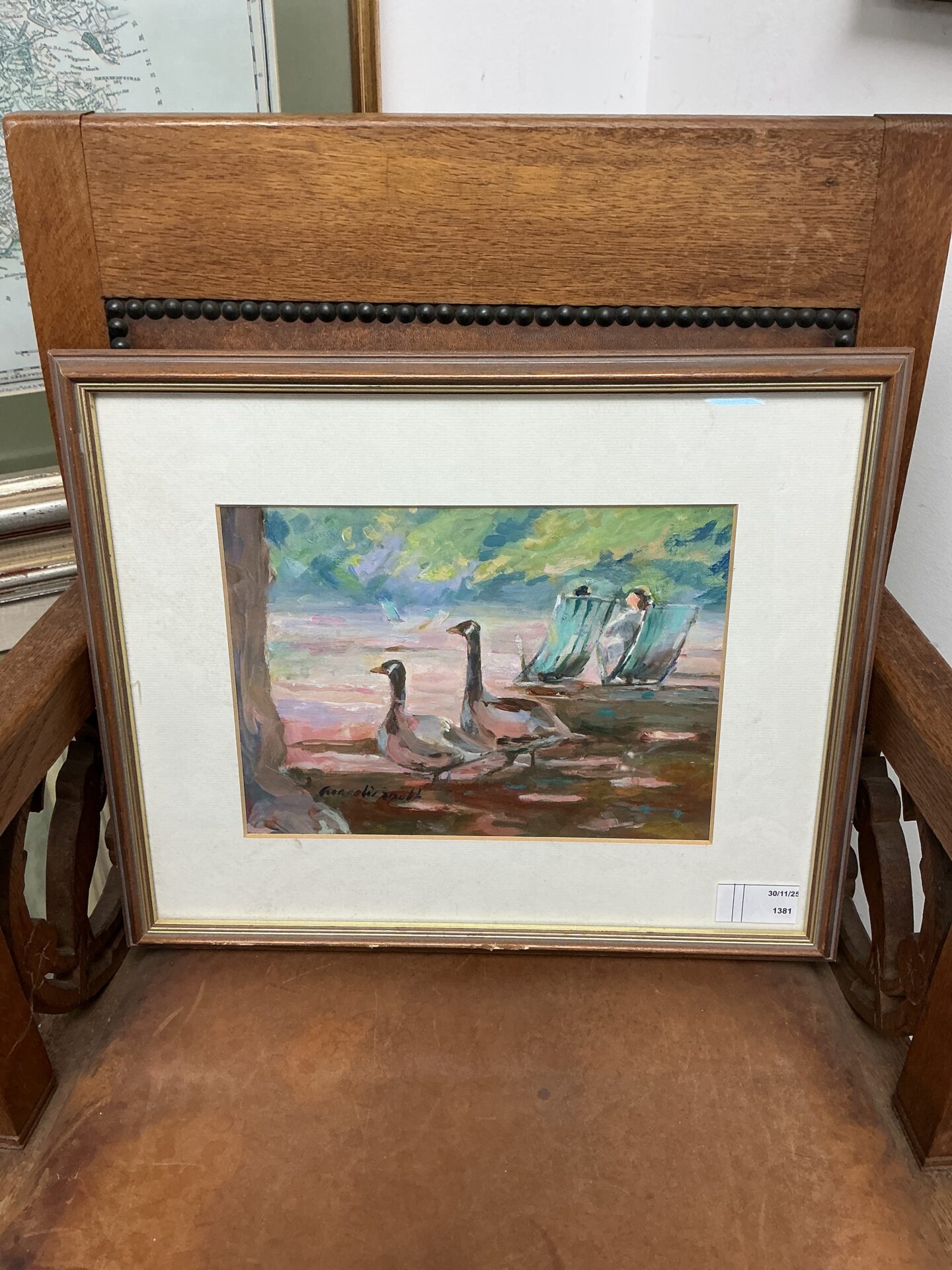 This is a charming vintage oil painting depicting a serene pond scene with geese. The artwork features a flock of geese resting near the water’s edge, with figures relaxing in the background, suggesting a peaceful countryside setting. The painting is signed by the artist, adding to its collectibility and character. The brushwork and colour palette evoke a classic style, reminiscent of traditional landscape paintings.