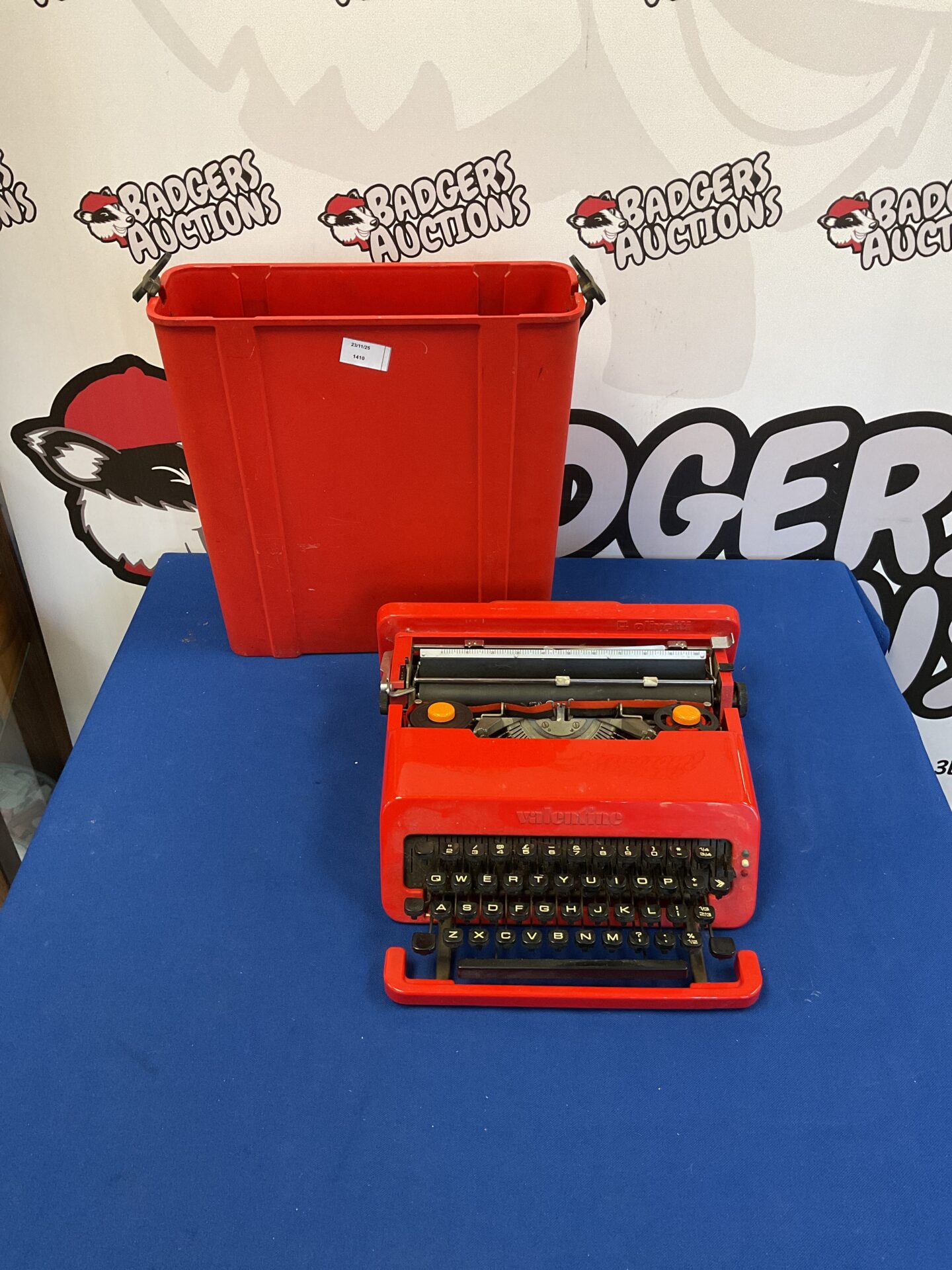 This is an Olivetti Valentine typewriter, a stylish and iconic portable typewriter designed by Sottsass Associati and produced in the 1960s and 70s. Known for its vibrant red plastic casing and distinctive design, the Valentine was intended to be a fashionable and accessible writing tool, breaking away from the traditional, bulky typewriters of the time. It features a QWERTY keyboard layout and is a prime example of Italian industrial design.