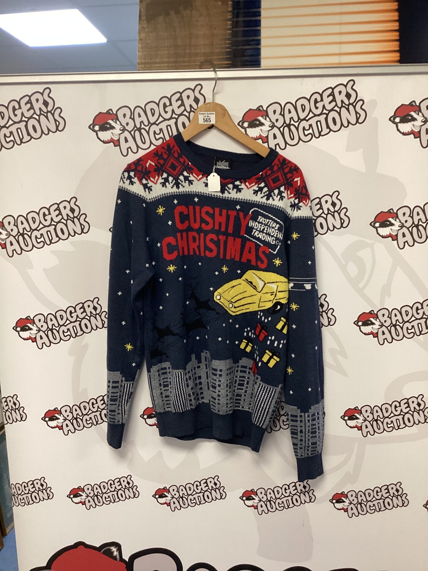 This jumper shows signs of wear consistent with its age, adding to its vintage charm. It is a desirable item for collectors of television memorabilia and vintage knitwear. The jumper’s association with a beloved British sitcom makes it a unique and eye-catching addition to any collection or festive wardrobe.