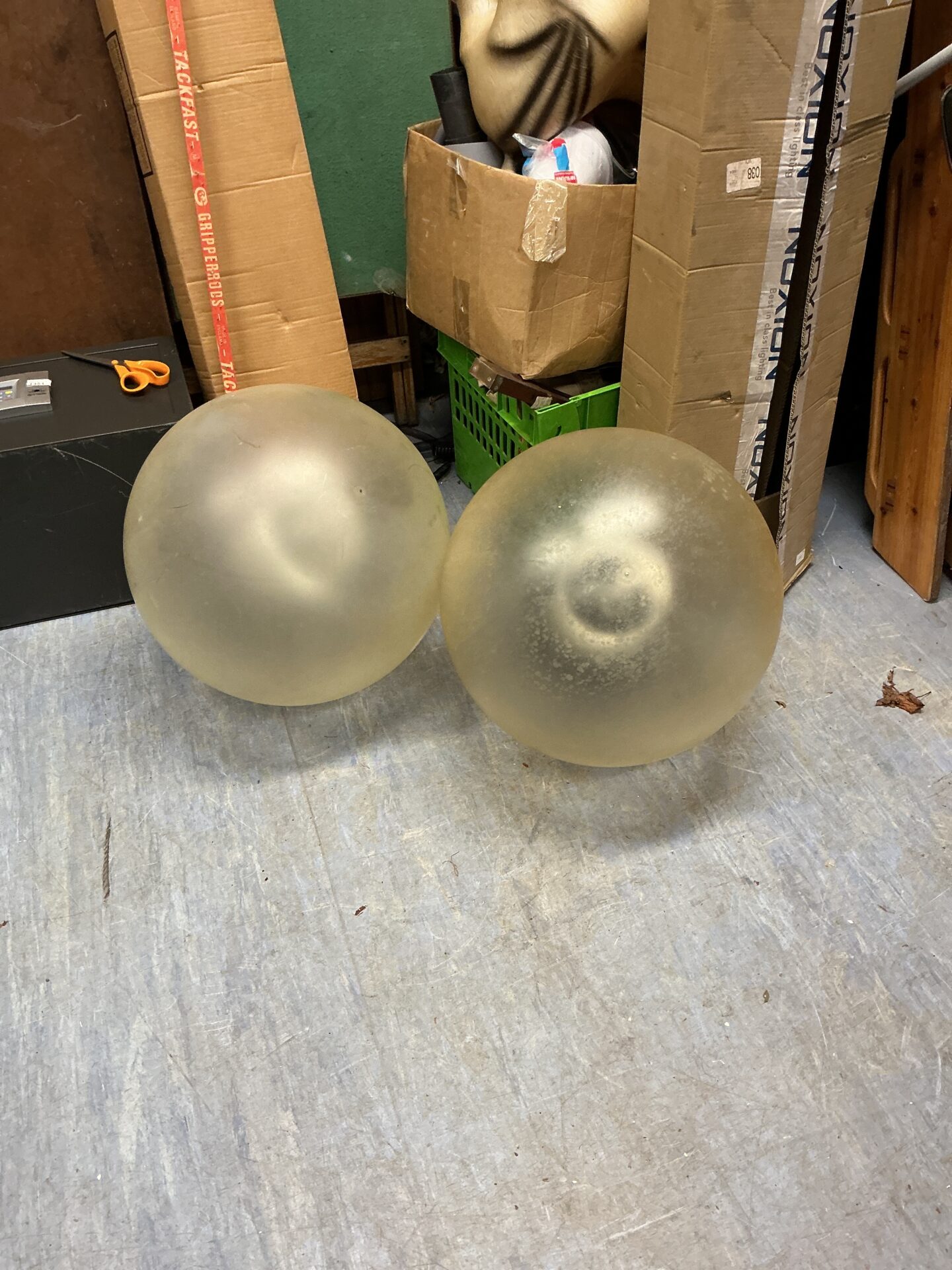 This lot includes two large Orbital Outside lamps, featuring a distinctive mid-century modern design. Constructed with a robust metal frame and spherical shades, these lamps are intended for exterior use. They present as found, with signs of age and patina, offering a restoration project or unique garden feature.