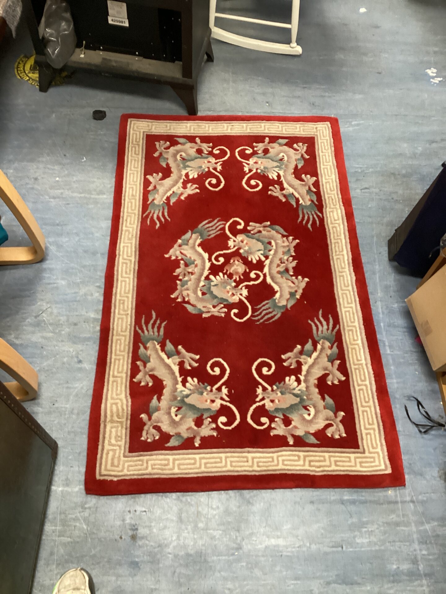 This striking rug features a vibrant red field adorned with a detailed oriental dragon pattern. The design is likely handwoven, showcasing traditional motifs and craftsmanship. The rug’s rich colour and intricate design make it a bold statement piece for any interior, adding a touch of exotic elegance and cultural heritage.