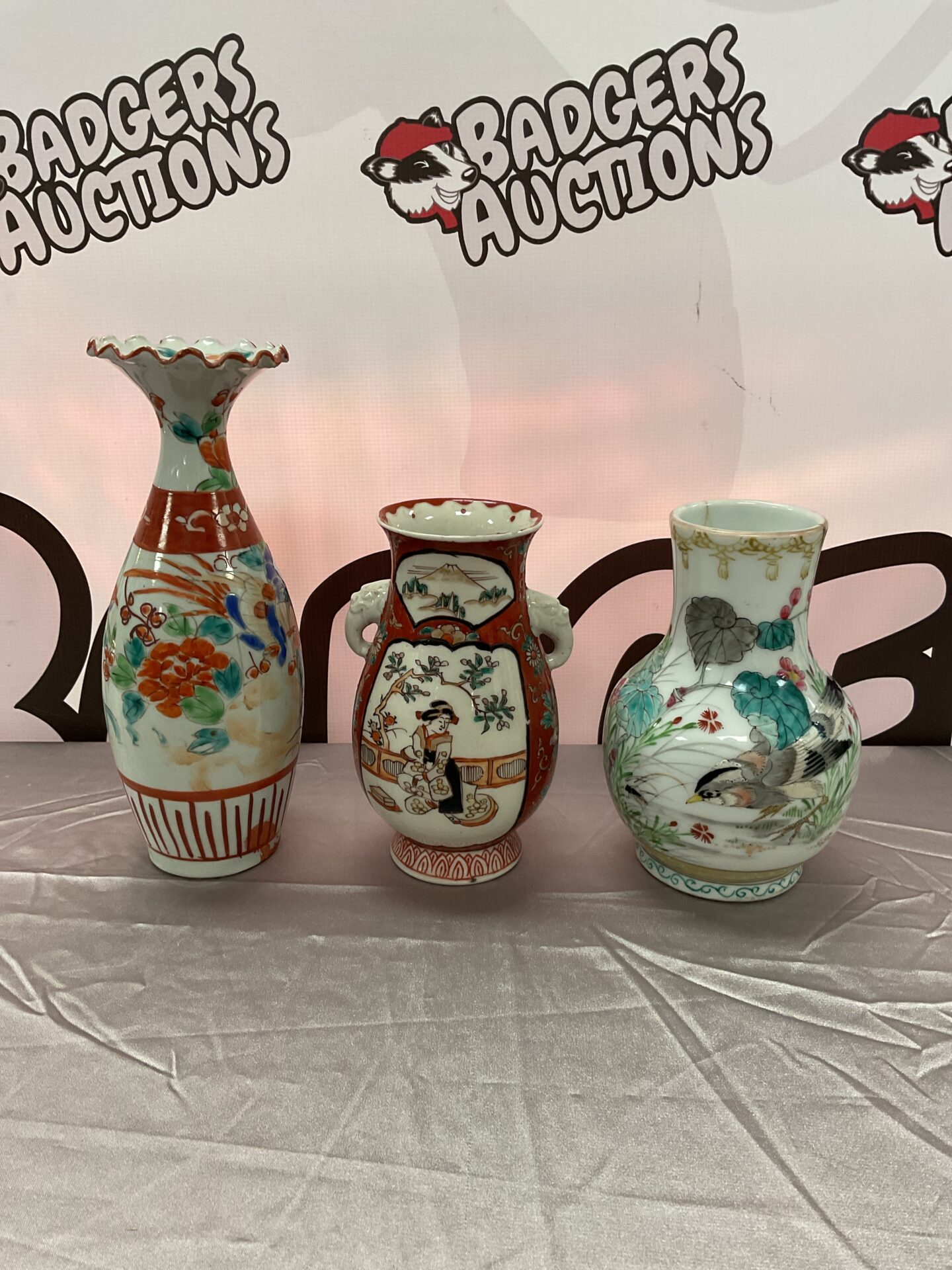 This lot comprises three beautifully decorated oriental vases, each showcasing intricate designs and vibrant colours. The tallest vase features a striking swallow bird pattern, a motif often associated with good fortune and springtime in Chinese culture. Crafted from ceramic, these vases exhibit the skilled artistry and attention to detail characteristic of oriental ceramics, making them a delightful addition to any collection or home décor.