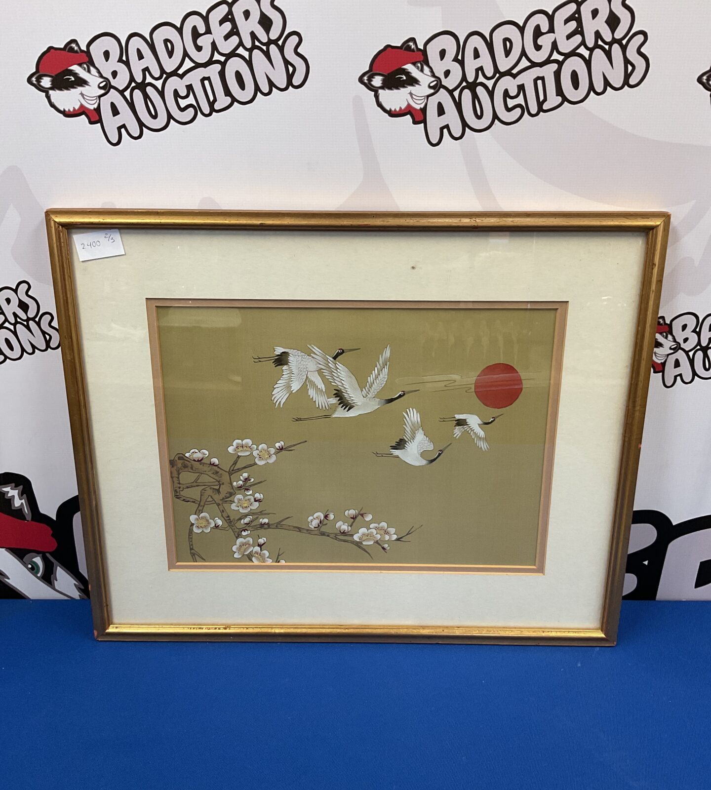 795 Oriental Watercolour On Silk Of Cranes In Flight