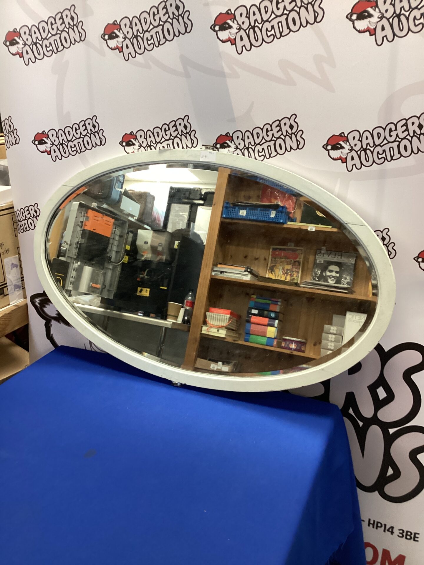 This is a charming oval wall mirror, finished in a crisp white paint. The mirror features a classic oval shape, adding a touch of elegance to any room. Its simple yet refined design makes it versatile enough to complement a variety of interior styles, from traditional to contemporary. The mirror’s size makes it suitable for hallways, bedrooms, or living spaces, offering both functionality and decorative appeal.