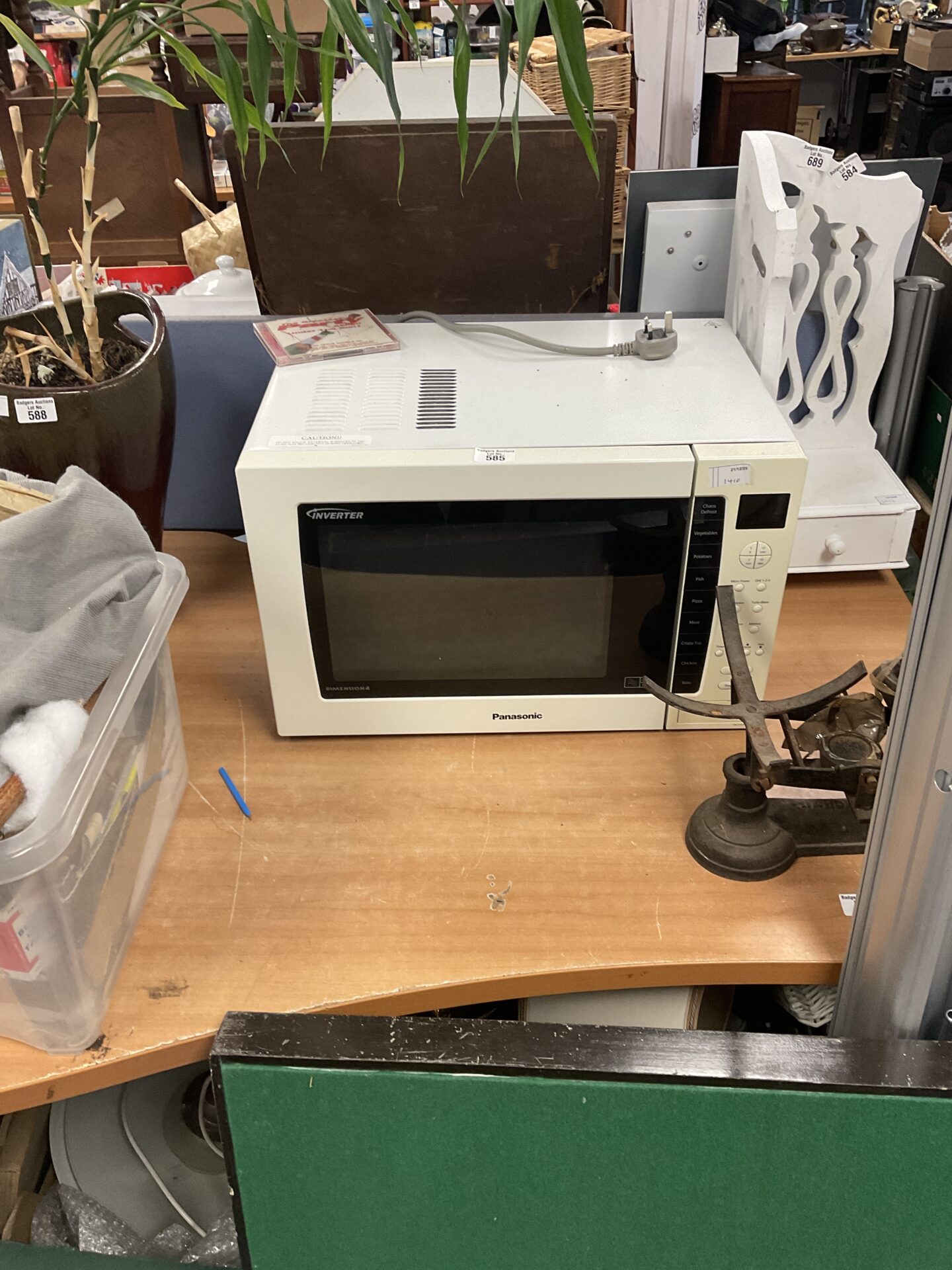 This is a Panasonic inverter microwave, designed for efficient and even cooking. The appliance features inverter technology, which delivers a consistent power level for optimal results. Its compact size makes it suitable for various kitchen spaces, offering a convenient solution for heating and cooking food.