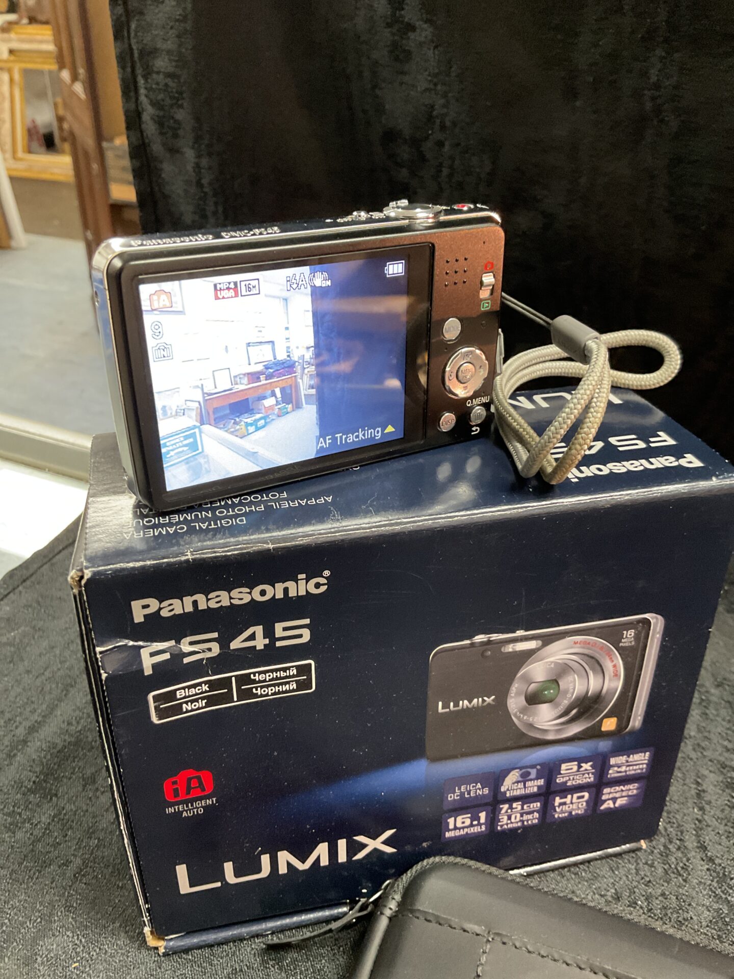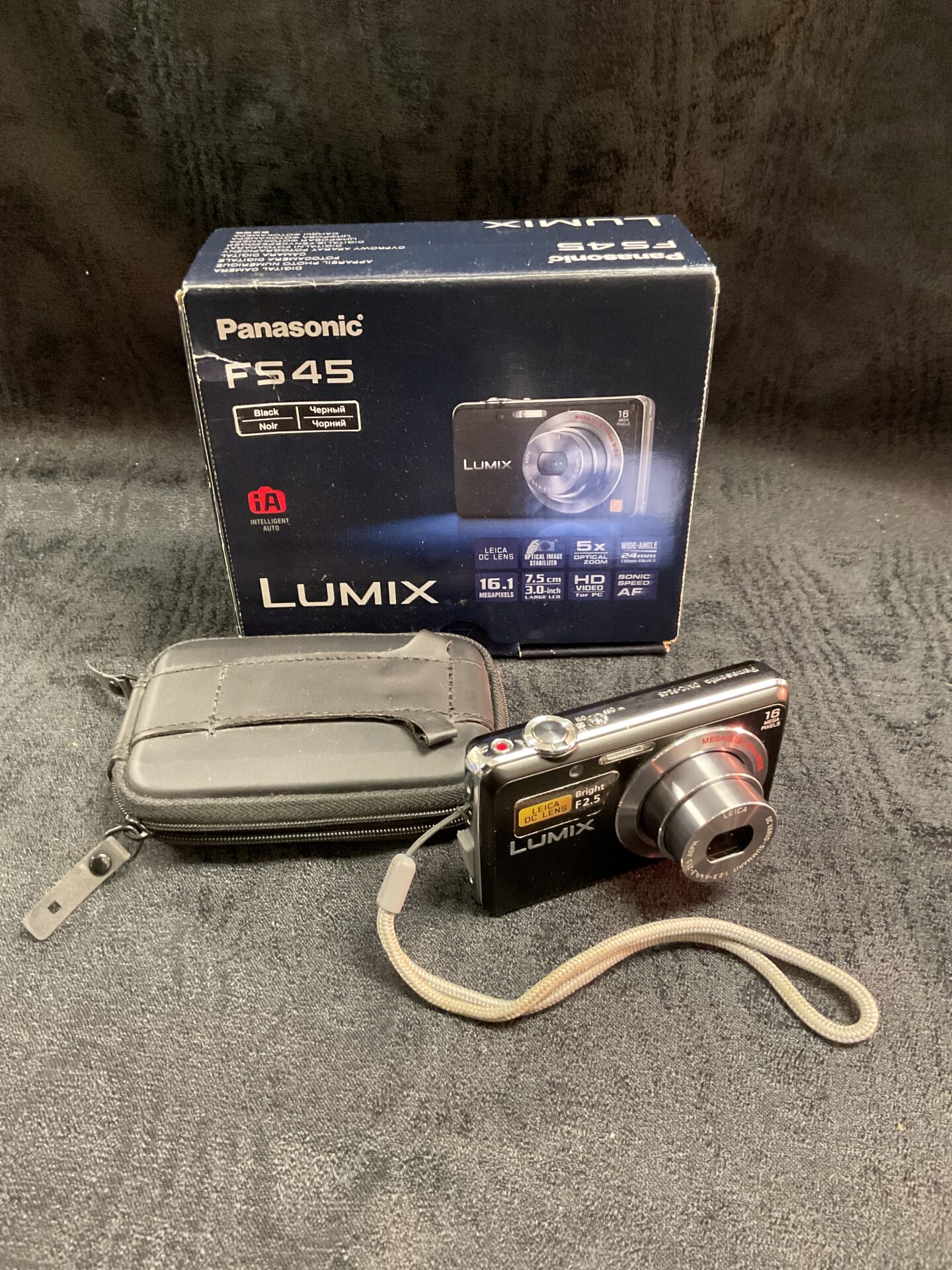 This Panasonic Lumix FS45 camera is presented with its original box and appears to be in used condition. It may appeal to collectors of vintage digital cameras or those seeking a functional, compact camera for casual use. Please examine the images carefully to assess its condition before purchase.