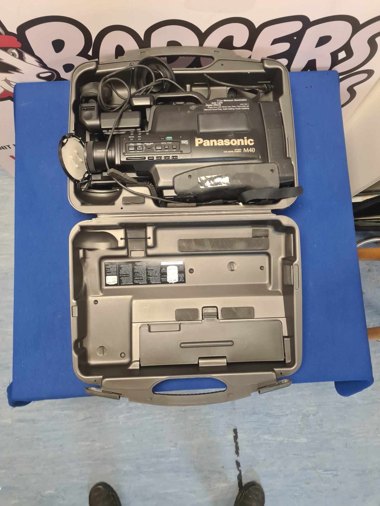 This Panasonic NV-M40 appears to be in good vintage condition, with some expected wear consistent with its age. It is a desirable item for collectors of vintage video equipment and those interested in retro technology. The inclusion of the original carrying case adds to its appeal and protects the camcorder during storage and transport.