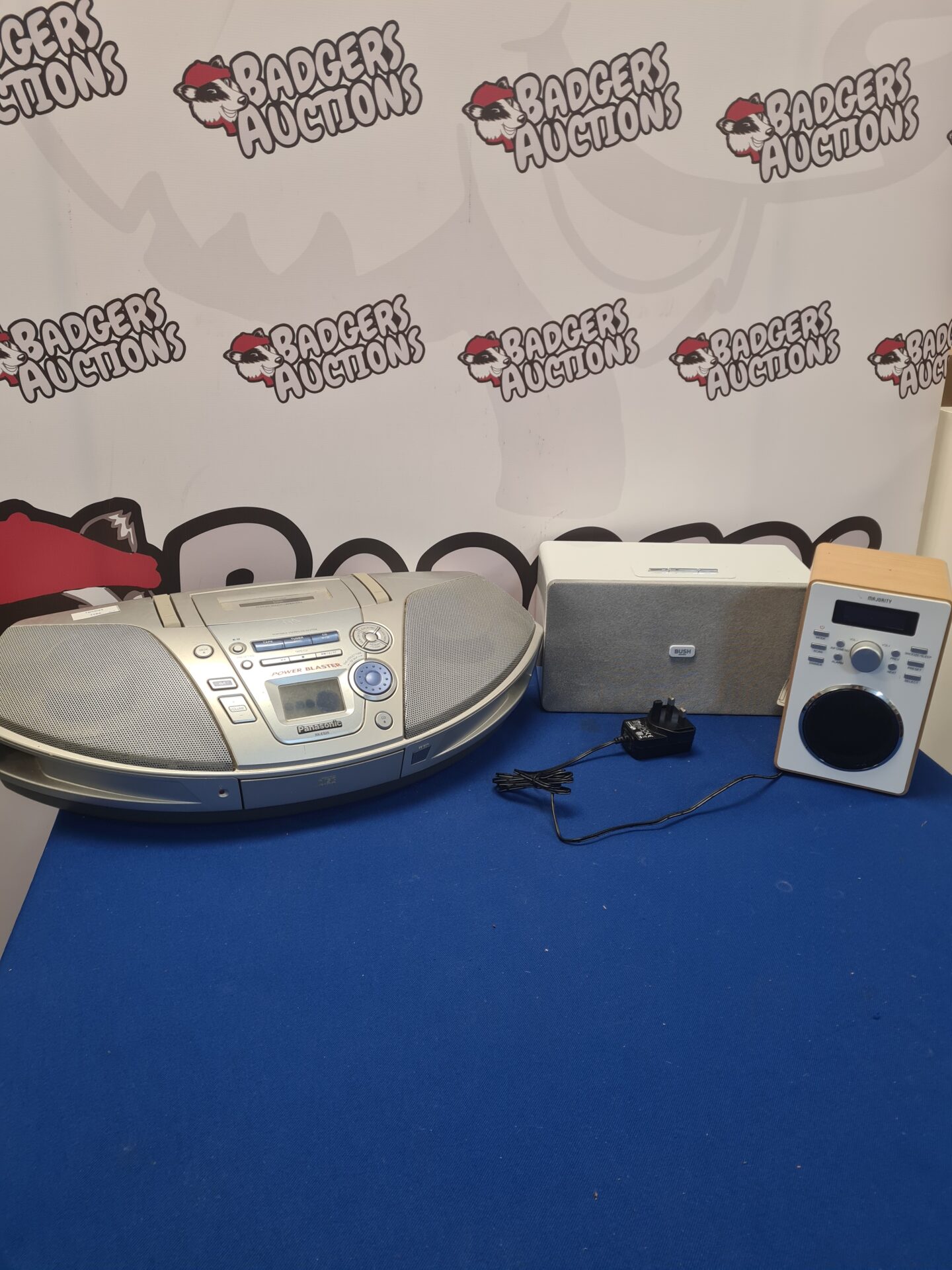 This Panasonic RX-ES25 appears to be in good used condition, showing signs of previous use but remaining fully functional. It’s a desirable item for collectors of vintage electronics and those seeking a portable audio solution with multiple playback options. The inclusion of the Bush Bluetooth speaker adds to its versatility and appeal.
