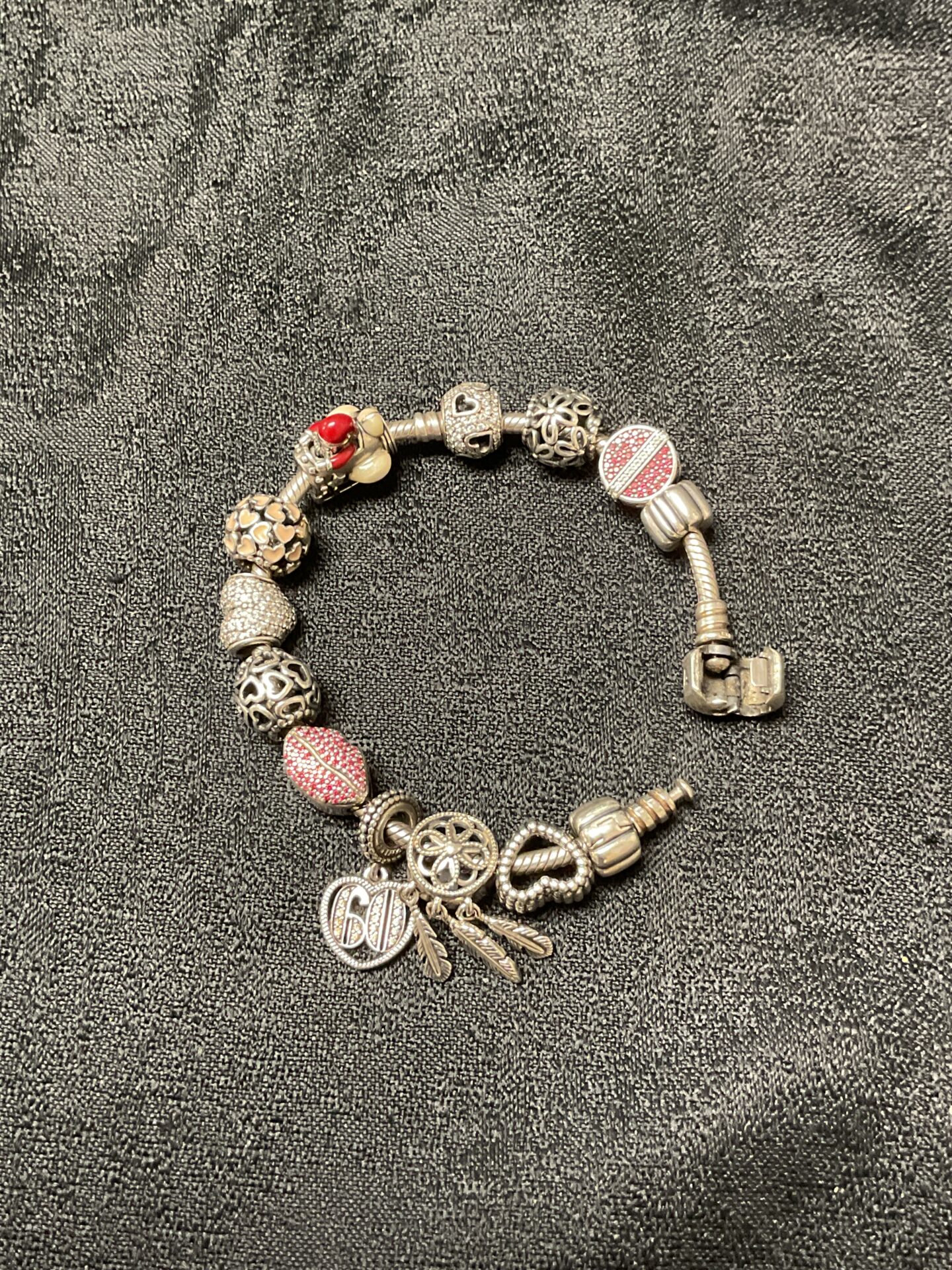 This Pandora charm bracelet is in excellent condition, showcasing minimal signs of wear. The charms are securely attached and retain their original sparkle and lustre. This bracelet is a desirable piece for collectors of Pandora jewellery and a beautiful addition to any fashion accessory collection. Its timeless design and quality craftsmanship ensure it will be treasured for years to come.