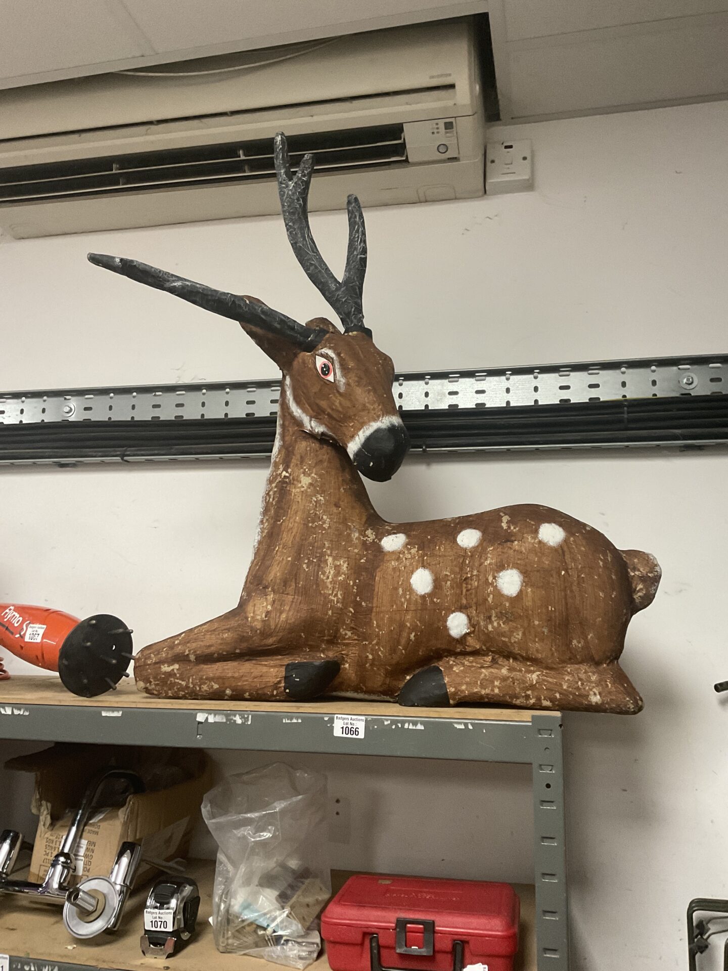 This is a large, decorative reindeer crafted from paper mache. The reindeer is posed in a standing position, exhibiting a rustic charm typical of vintage holiday decorations. Its textured surface and hand-crafted appearance suggest it was likely made for festive displays during the Christmas season.