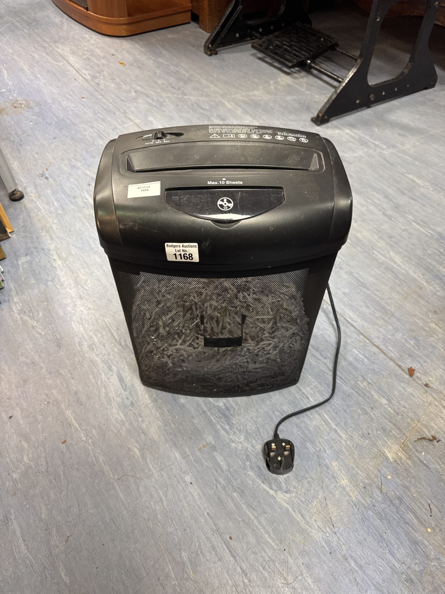 This paper shredder is presented for auction in used condition. It appears generally sound in construction, though a full operational check has not been undertaken. It may be of interest to those seeking a functional office appliance or a collector of vintage office equipment.