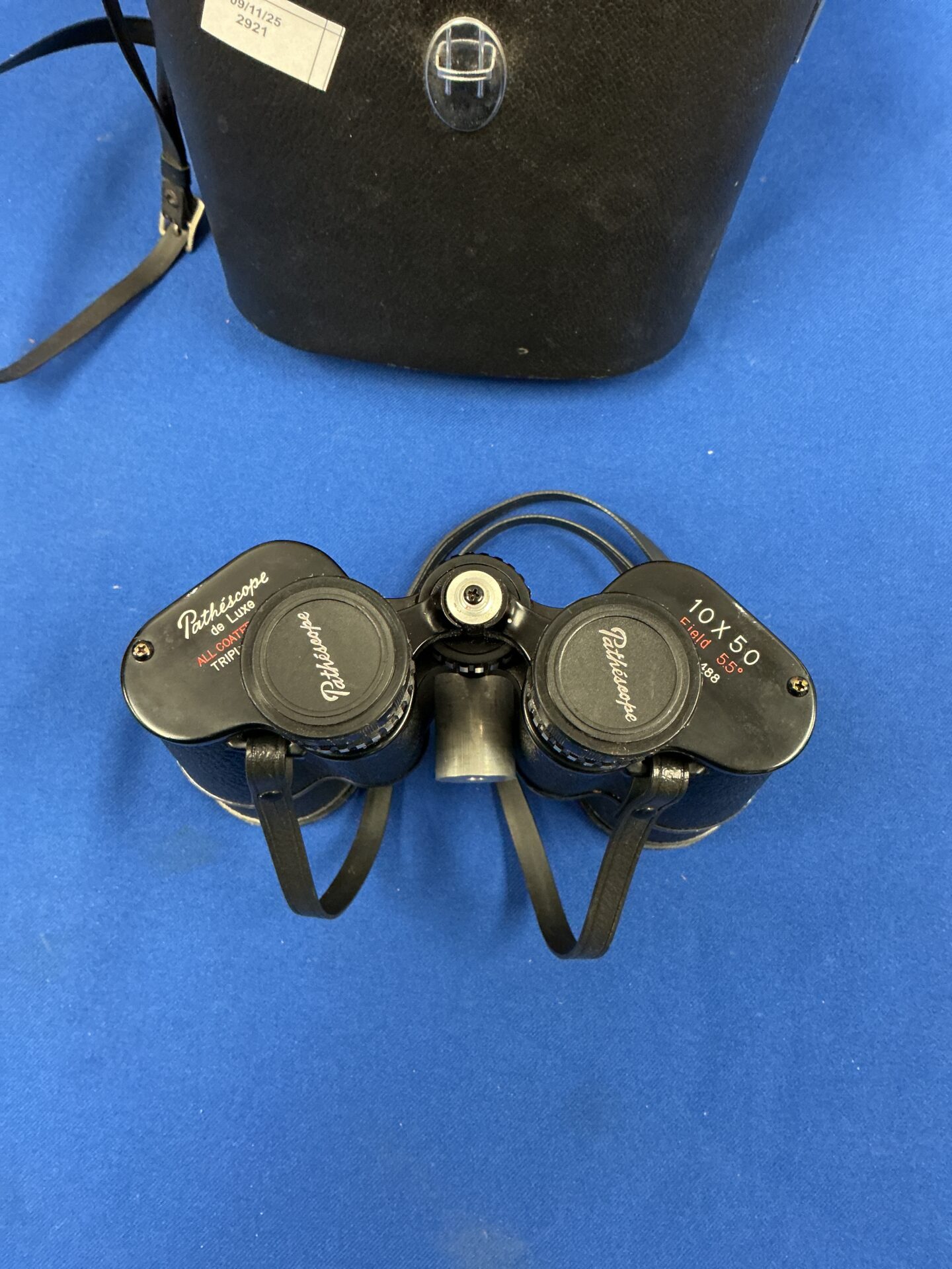 These are a pair of Pathescope 10×50 binoculars. They feature a classic, robust design typical of mid-century optics. The binoculars are presented with their original carrying case, suggesting a focus on portability and protection during use.