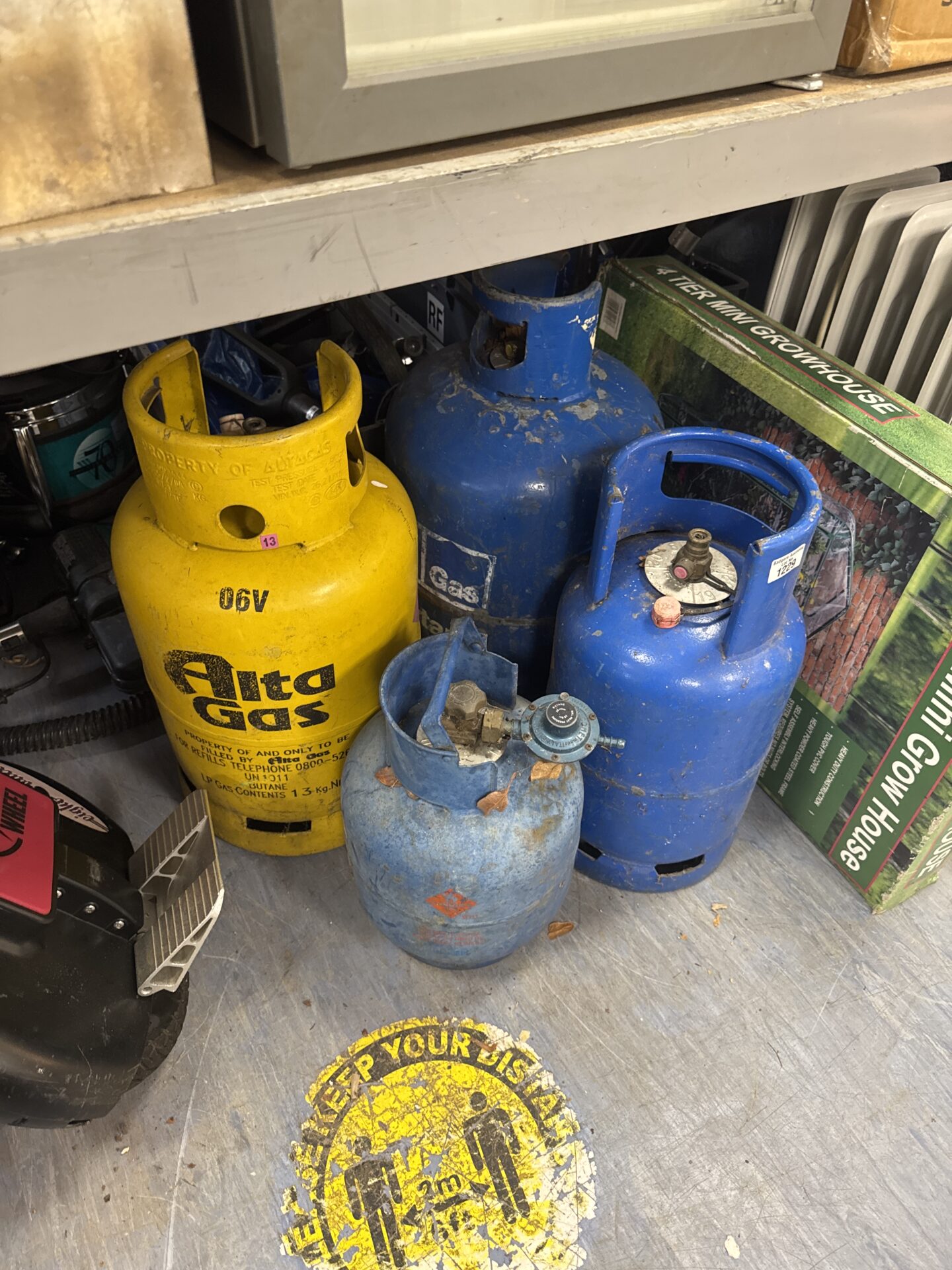 This lot comprises four assorted patio gas canisters, ideal for portable heaters or cooking appliances. The canisters vary in colour and size, offering a mix of potential uses. They appear to be standard butane/propane mix canisters commonly used for outdoor activities and garden appliances.