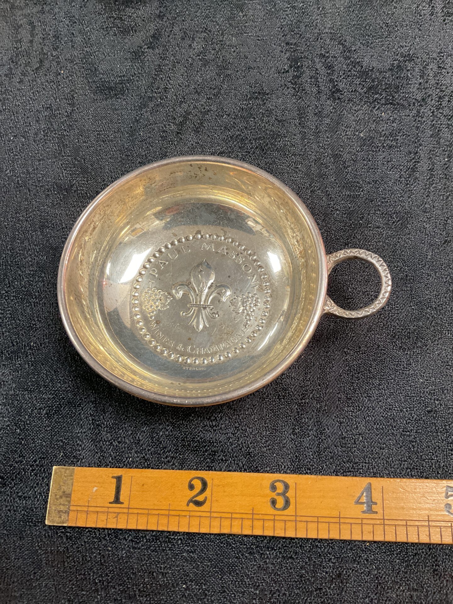 This cup shows signs of use consistent with its age, and may exhibit minor surface wear or patina. It is a desirable piece for collectors of silver, wine-related items, or vintage barware. The cup’s quality and maker’s mark make it a unique addition to any collection or a sophisticated piece for entertaining.