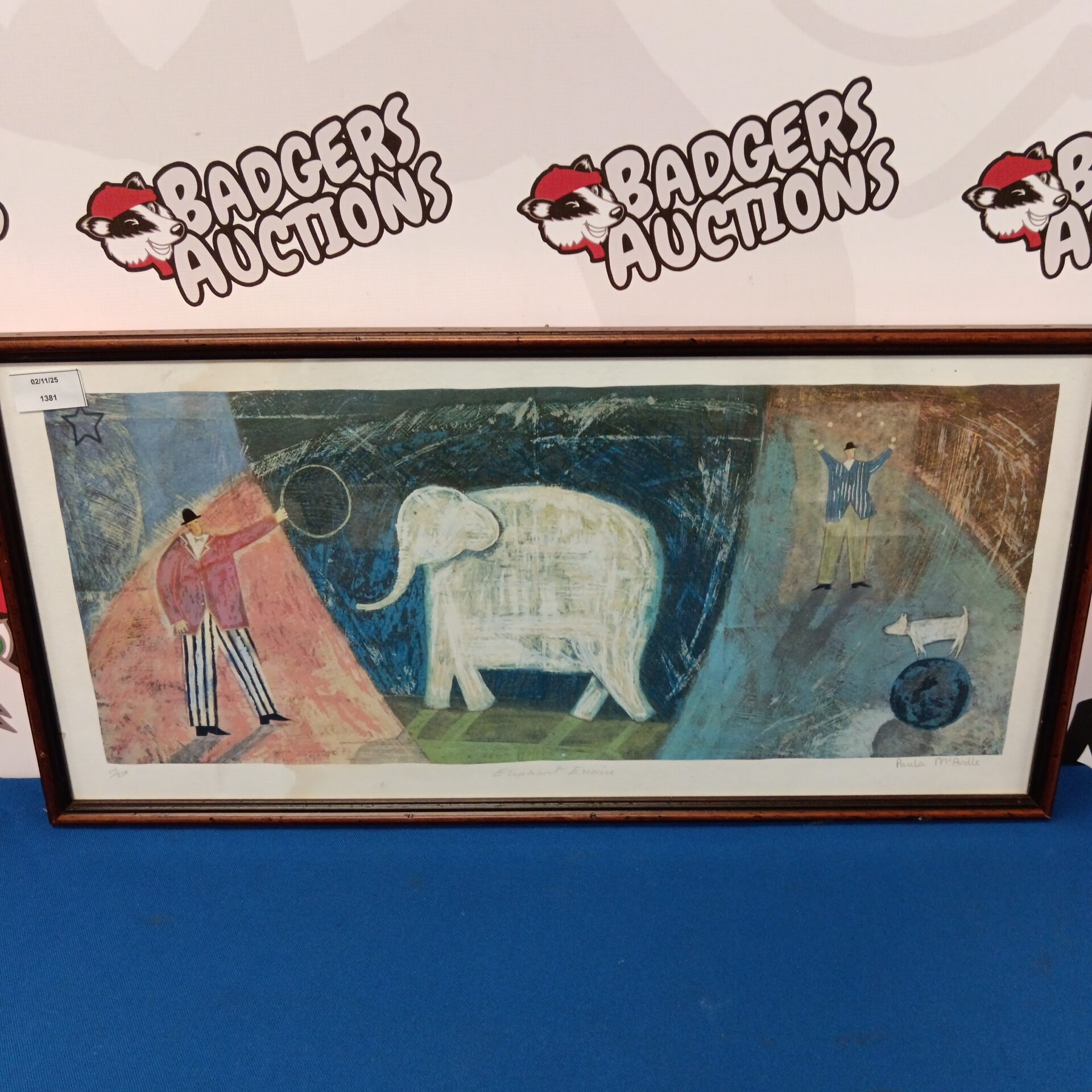 This is a limited edition giclée print titled “Elephant Exercise” by artist Paula Mcardle. The artwork depicts a whimsical scene of an elephant in a vibrant, colourful style. The print is signed by the artist and showcases a playful, contemporary aesthetic, making it a unique addition to any art collection.