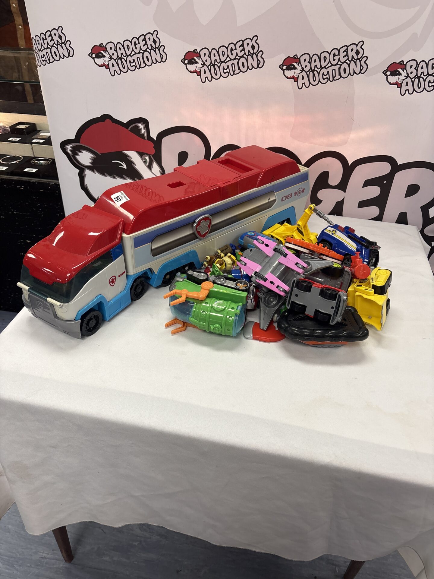 This lot features a collection of Paw Patrol toys, including the Paw Patrol Patroller vehicle. The bundle includes various character figures such as Skye, Chase, and Marshall, alongside their corresponding vehicles. This set offers a fun and engaging play experience for young fans of the popular animated series.