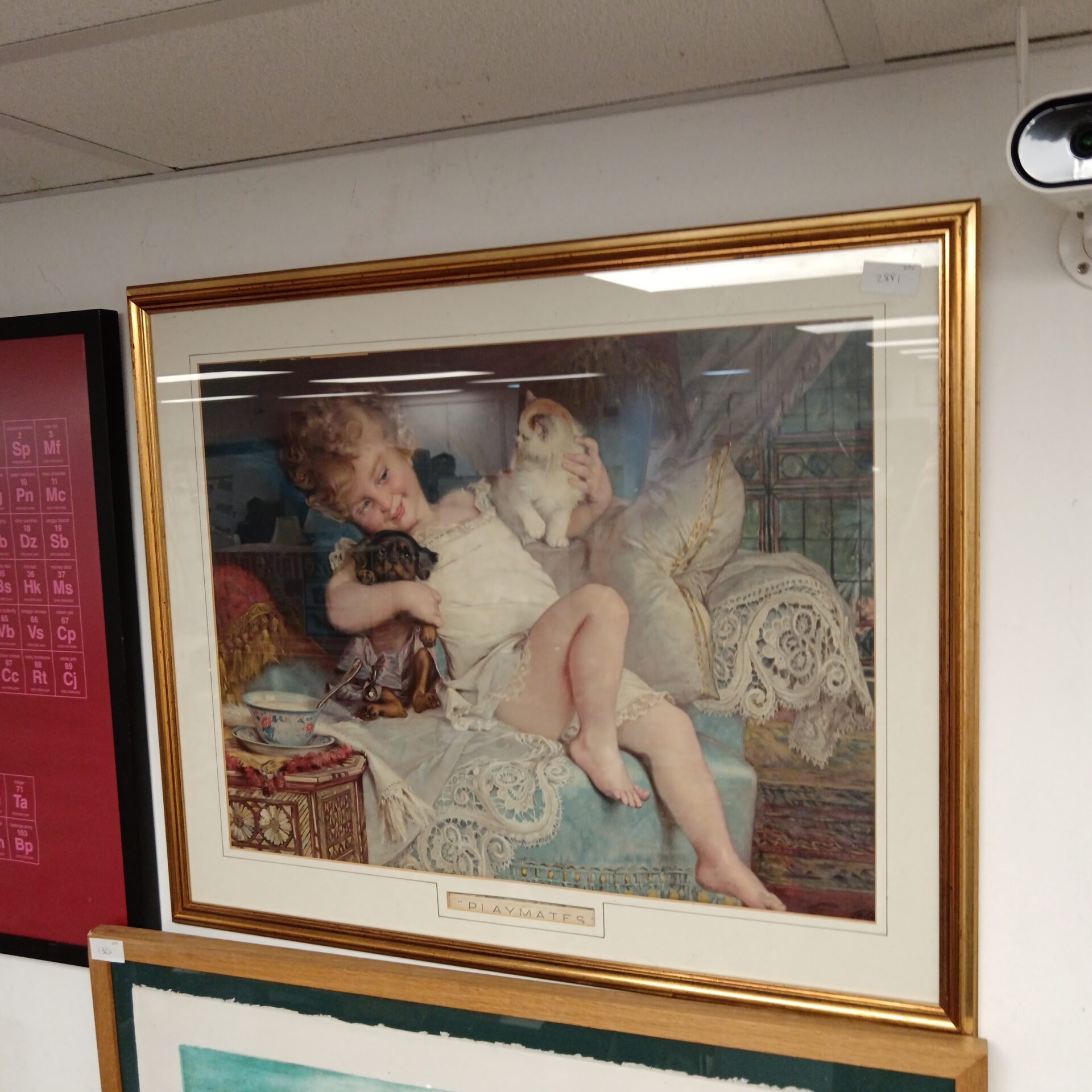This is a large and beautifully framed advertising print for Pears Soap, titled “Playmates”. The print depicts two cherubic children playing with building blocks, rendered in a classic Victorian style. The artwork was originally created to promote Pears Soap, and this particular example is housed in an ornate, gilt frame, enhancing its visual appeal and making it a striking piece of wall decor.