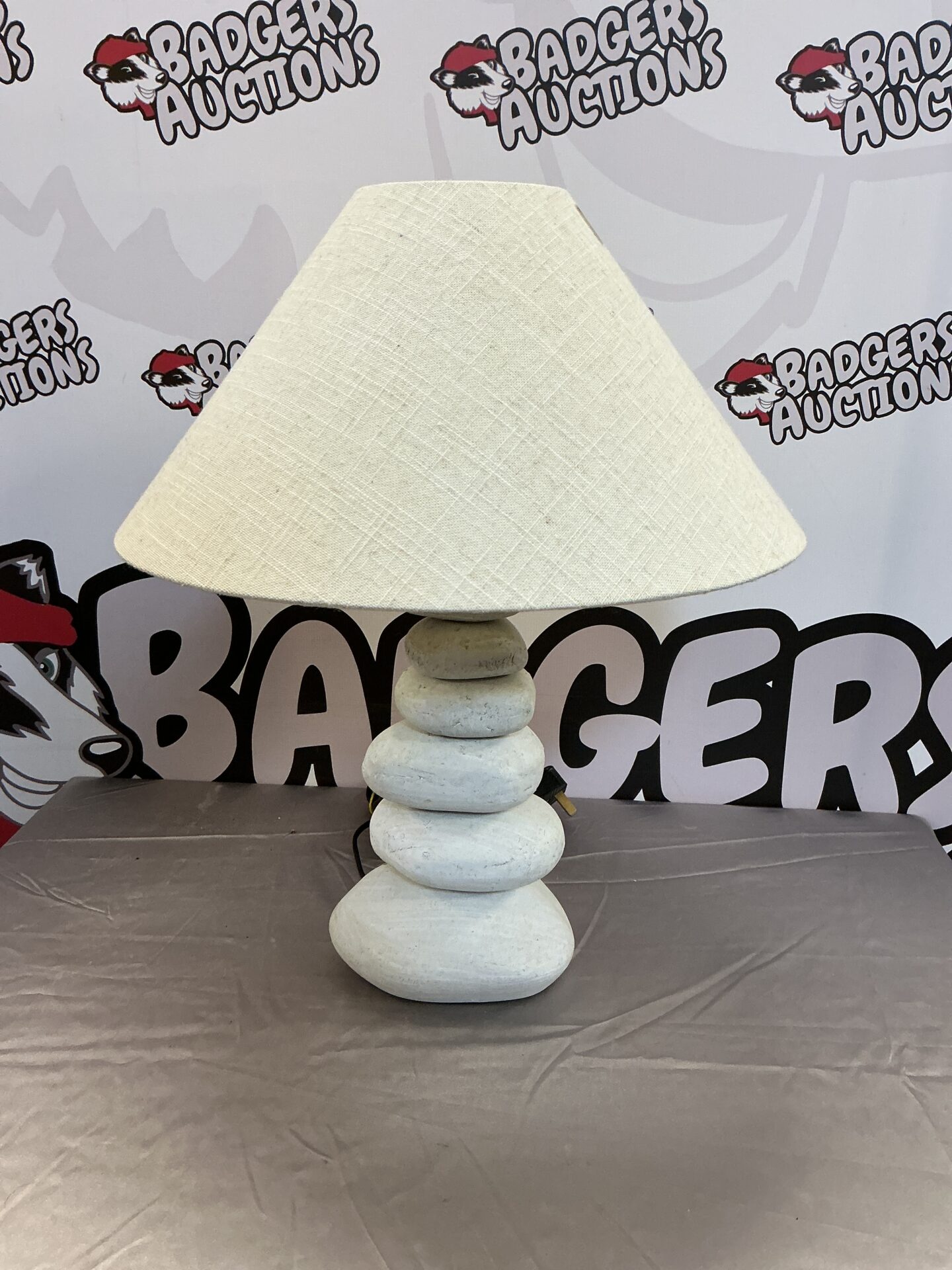 This is a decorative table lamp featuring a stacked pebble-style design. The base is constructed from a ceramic material, giving it a substantial and earthy feel. The lamp has a neutral colour palette, making it versatile for various interior styles. It’s a sculptural piece that would add a unique touch to a bedside table, console, or living space.