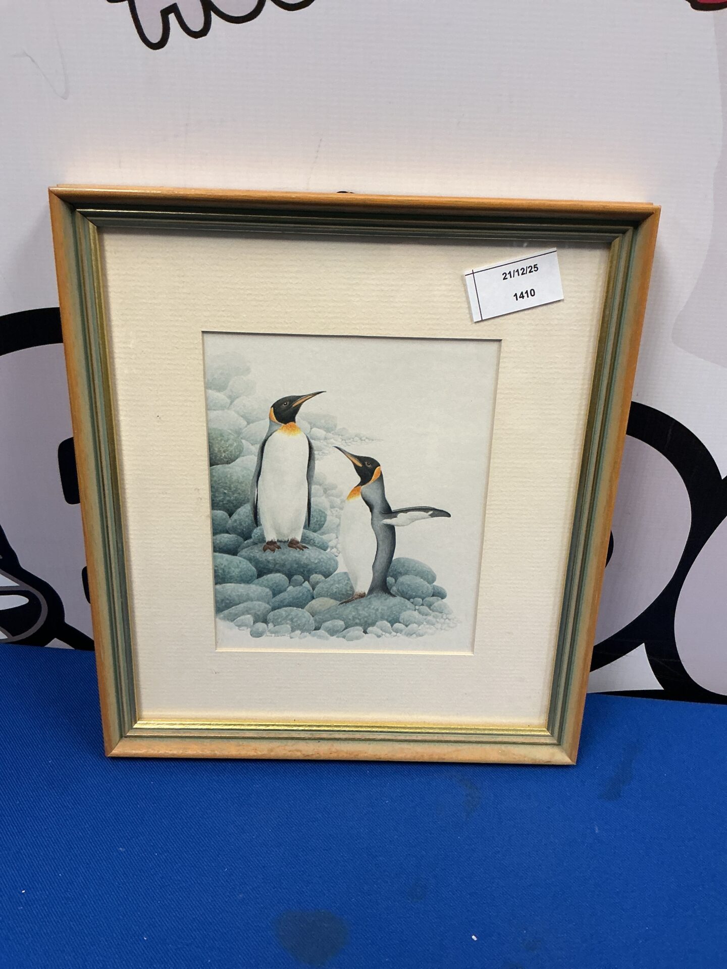 This is a charming watercolour painting depicting a pair of penguins. The artist has captured the birds in a naturalistic style, with attention to detail in their plumage and posture. The painting is presented behind glass in a simple, light-toned frame, enhancing the artwork’s delicate aesthetic.