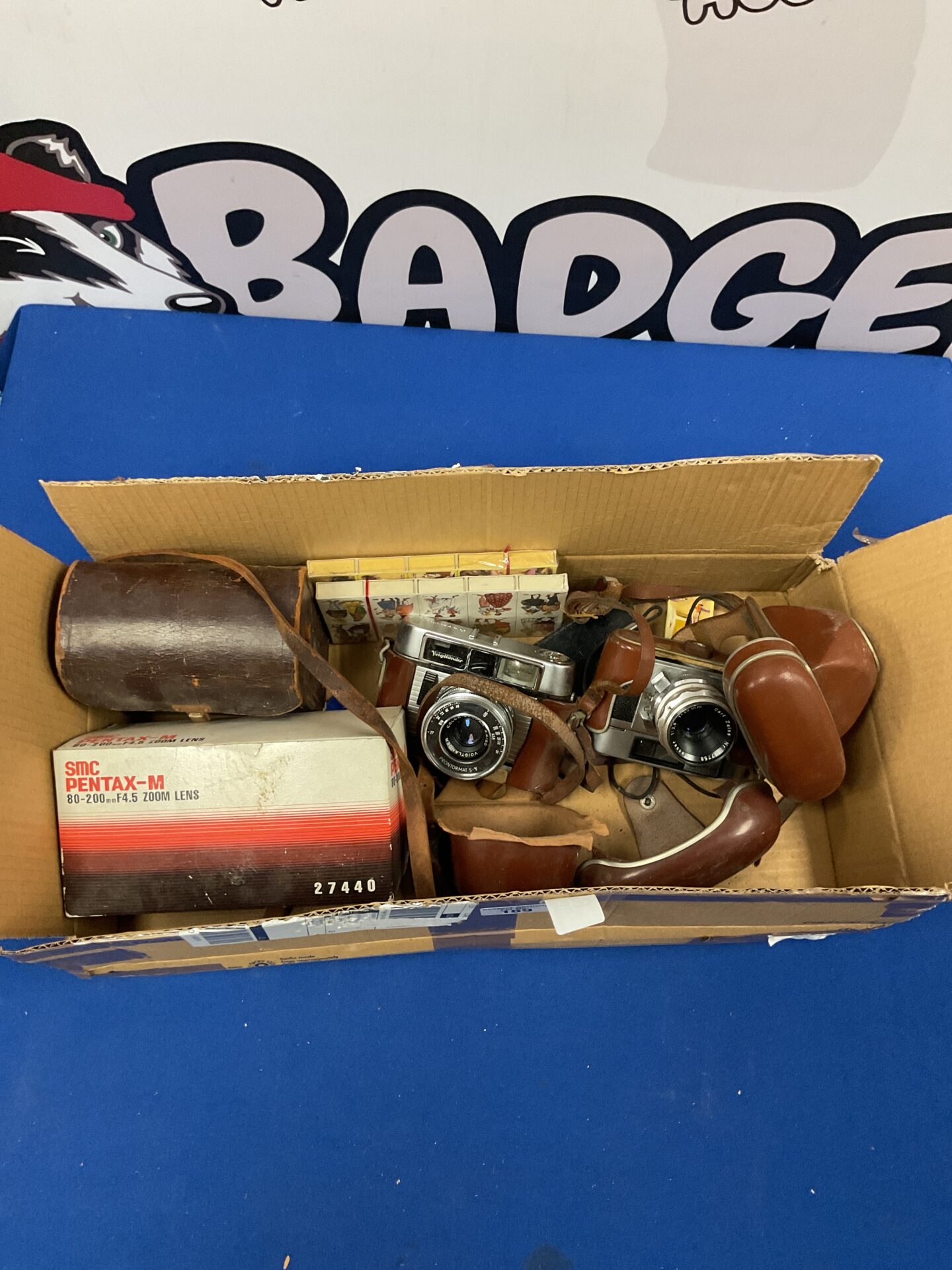 This lot features a selection of Pentax cameras and accessories. The collection includes a Pentax K1000, a popular 35mm film SLR known for its mechanical operation and durability. Also included are various lenses, including an SMC Pentax 80-200mm zoom lens, and other photographic accessories, offering a comprehensive kit for film photography enthusiasts.