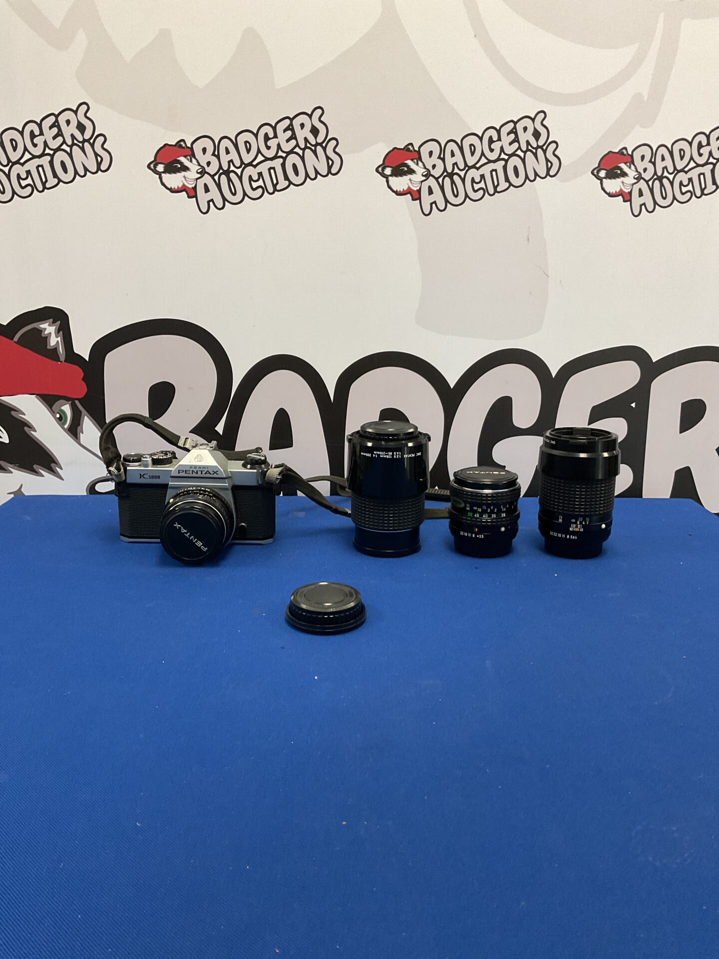The Pentax K1000 is a classic 35mm single-lens reflex (SLR) film camera renowned for its simplicity, durability, and excellent image quality. This particular lot includes the camera body along with three Pentax lenses, offering a versatile setup for film photography enthusiasts. The K1000 was a popular choice for photography students and professionals alike, celebrated for its fully mechanical operation and reliable performance.