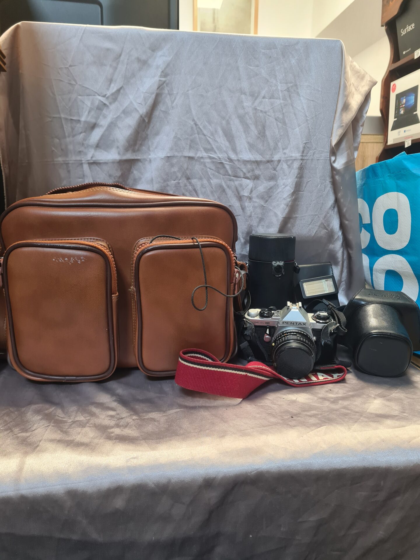 This lot features a Pentax ME Super 35mm film camera, a popular model known for its electronic shutter and compact design. The camera is accompanied by a lens, a flash unit, and a dedicated carrying case. The Pentax ME Super was a well-regarded camera in its time, offering a blend of features and portability that appealed to both amateur and experienced photographers.