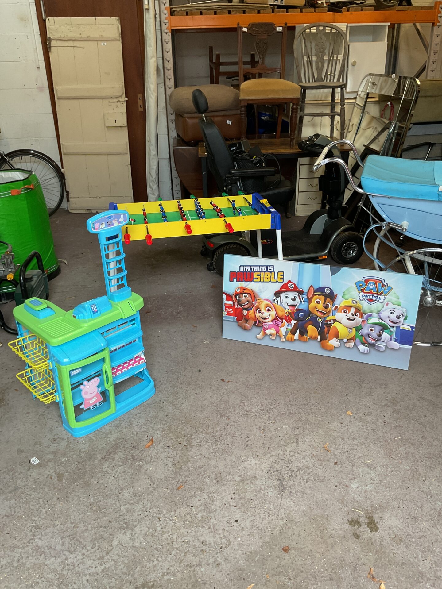 This colourful play kitchen set is perfect for budding chefs! It features a Peppa Pig themed kitchen, complete with accessories for imaginative play. Alongside the kitchen, this lot includes a mini football table for added fun and a vibrant Paw Patrol canvas print to brighten up any room. This set offers a complete play experience for young children.