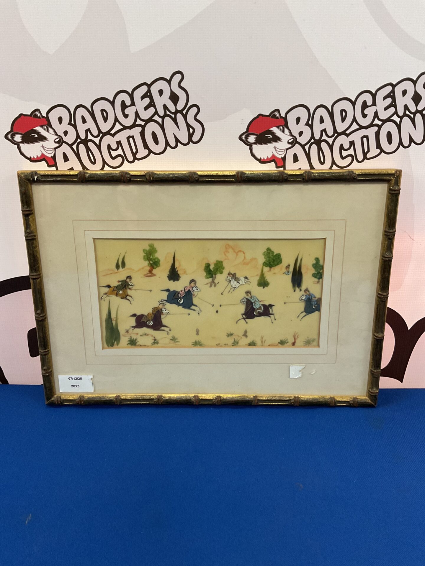 The painting exhibits signs consistent with age, including minor craquelure and surface wear, which add to its antique character. Despite these imperfections, the colours remain remarkably vivid, and the overall composition is well-preserved. This piece would be of interest to collectors of Islamic art, historical paintings, or those seeking a unique and evocative decorative element.