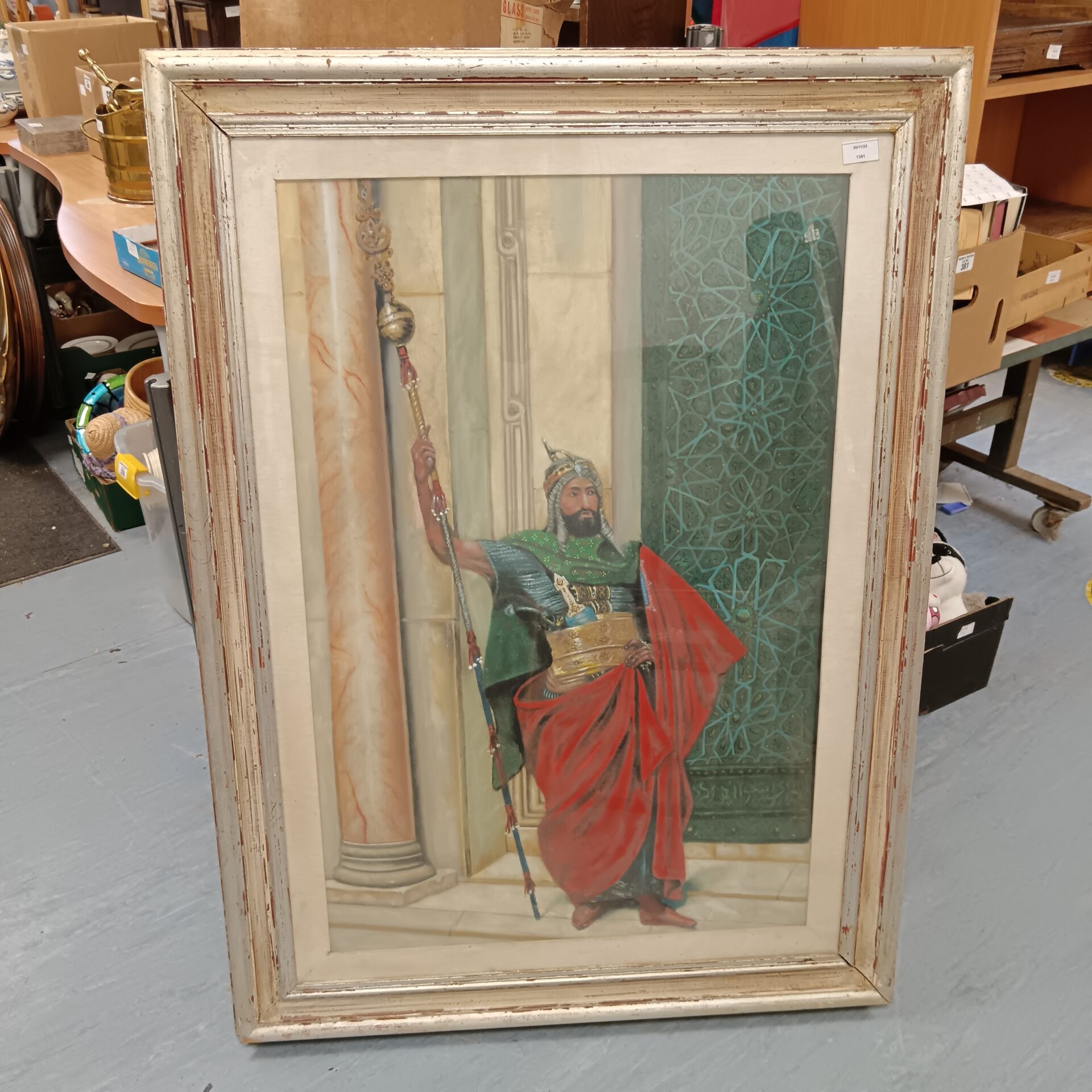This is a large and striking oil painting depicting a Persian warrior, rendered in the Orientalist style popular in the 19th century. The warrior is richly attired in elaborate garments and armour, holding a spear, and set against a backdrop of intricate patterns. The artist has paid close attention to detail in the rendering of the fabrics, weaponry, and facial features, creating a visually compelling and historically evocative work.