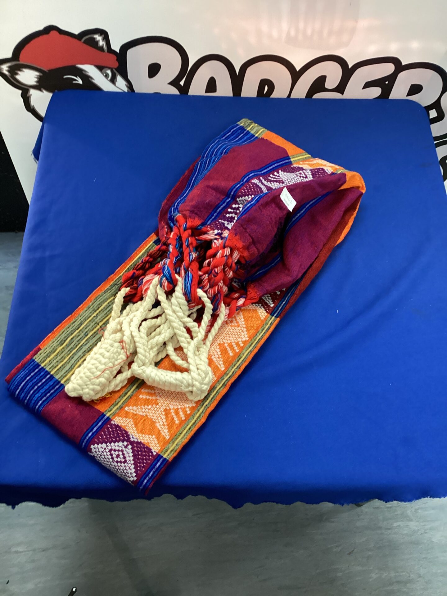 This hammock appears to be in gently used condition, displaying the natural character of a handmade item. While showing signs of wear consistent with age and use, it remains a visually striking piece. Collectors of folk art, textiles, or bohemian decor will appreciate its unique aesthetic and cultural significance.