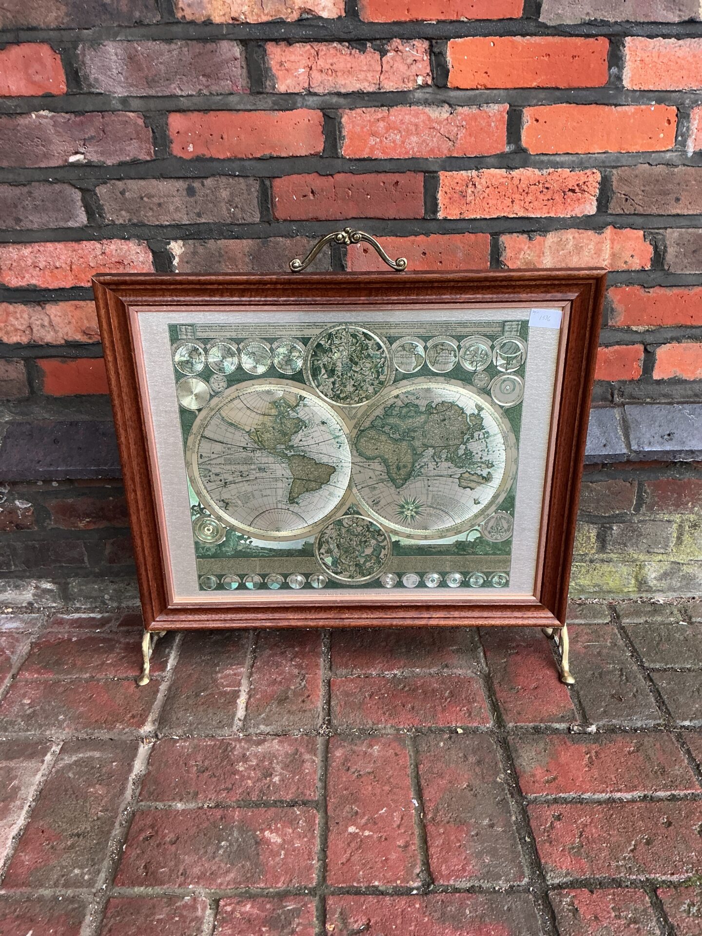 This fire guard exhibits signs of age and use, consistent with its antique status. The oak frame shows some wear and patina, adding to its character. This piece would appeal to collectors of antique maps, cartography enthusiasts, or those seeking a unique and historically significant decorative item. The combination of functionality and aesthetic appeal makes it a desirable addition to any collection.