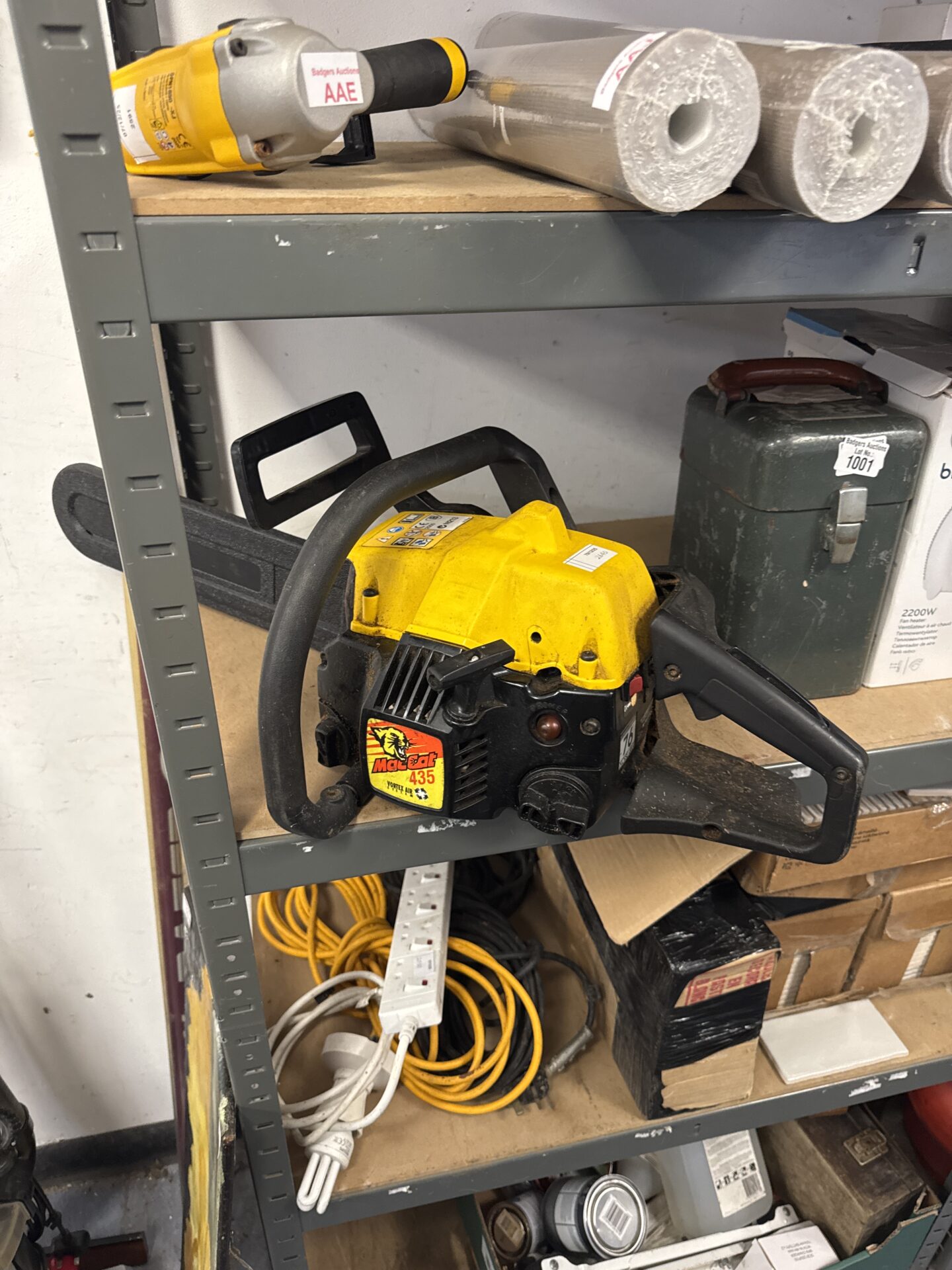 This is a Mac Cat 435 petrol chainsaw, featuring a vortex air system. This chainsaw is designed for cutting wood and is powered by a petrol engine. It appears to be a handheld model, suitable for various garden and DIY tasks.