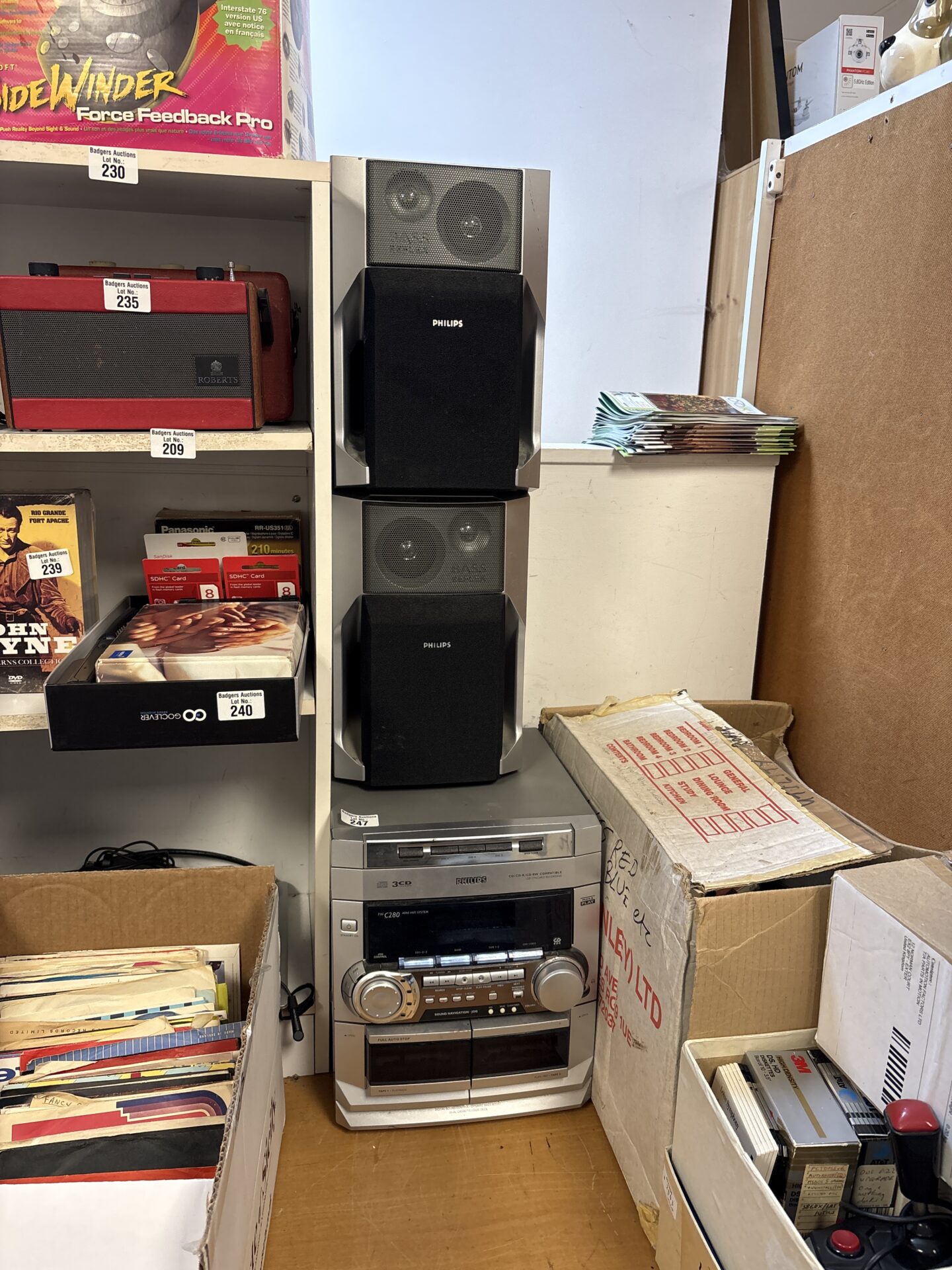 This lot features a Phillips compact disc player paired with two Phillips bass speakers. The system appears to be designed for home audio enjoyment, offering a classic stereo experience. The speakers are designed to enhance lower frequencies, providing a richer sound profile.