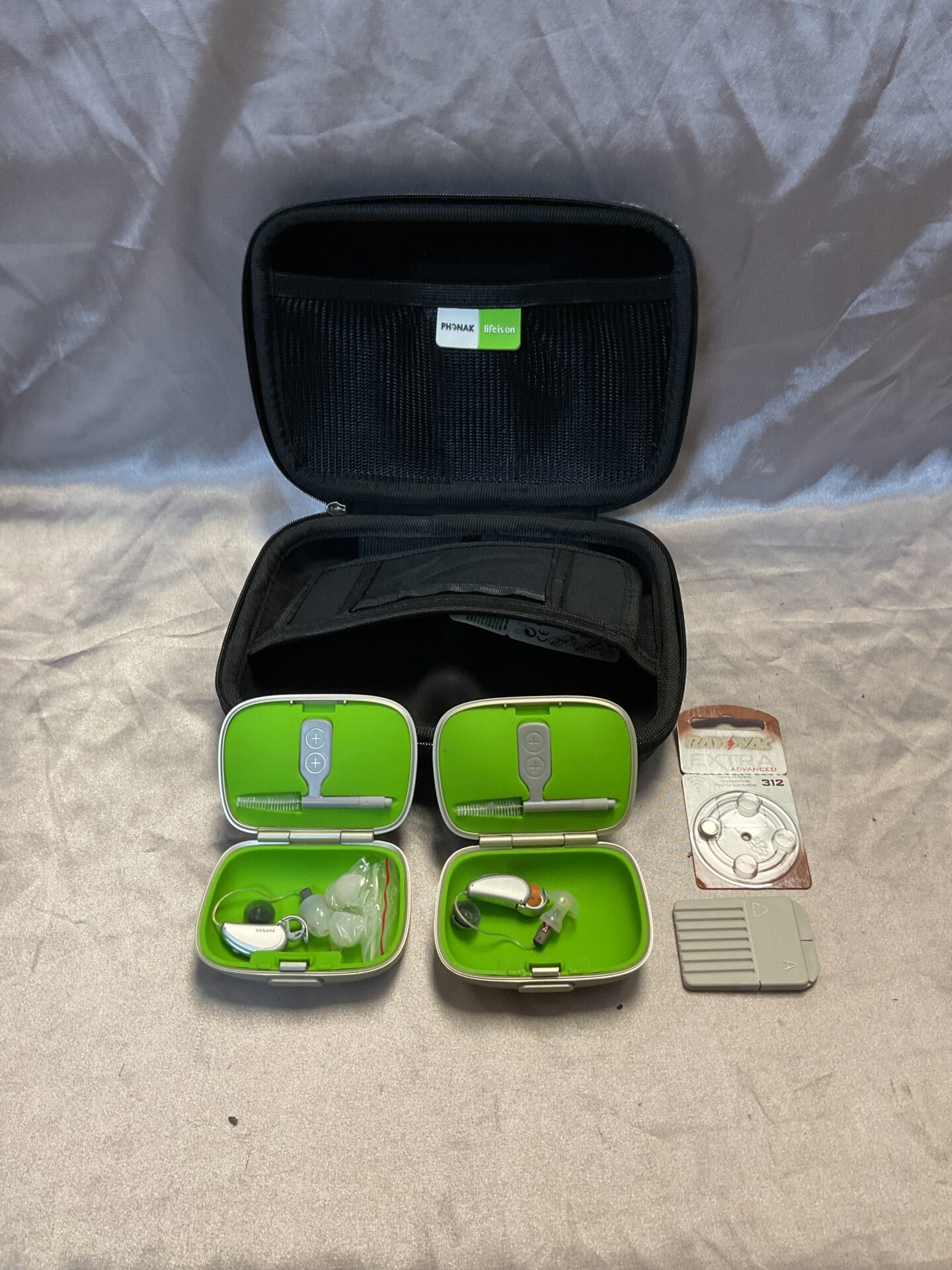 This lot features two sets of Phonak hearing aids, presented in a protective carrying case. The aids appear to be behind-the-ear style, designed for discreet wear and improved sound amplification. The case provides storage and protection when not in use, and is branded with the Phonak logo.