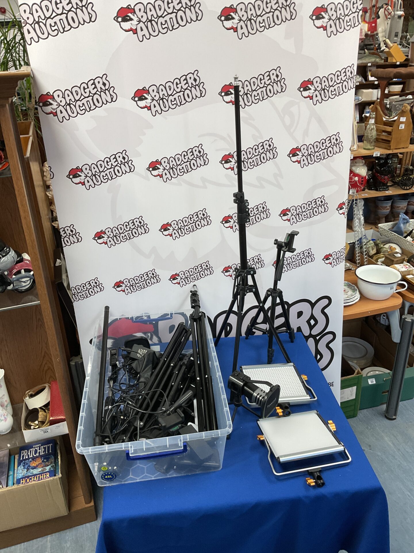 This lot features a collection of photography tripods and lights, ideal for studio or location shoots. The collection includes a variety of tripod stands and adjustable lighting units. This lot is suited for photographers or collectors of photography equipment.