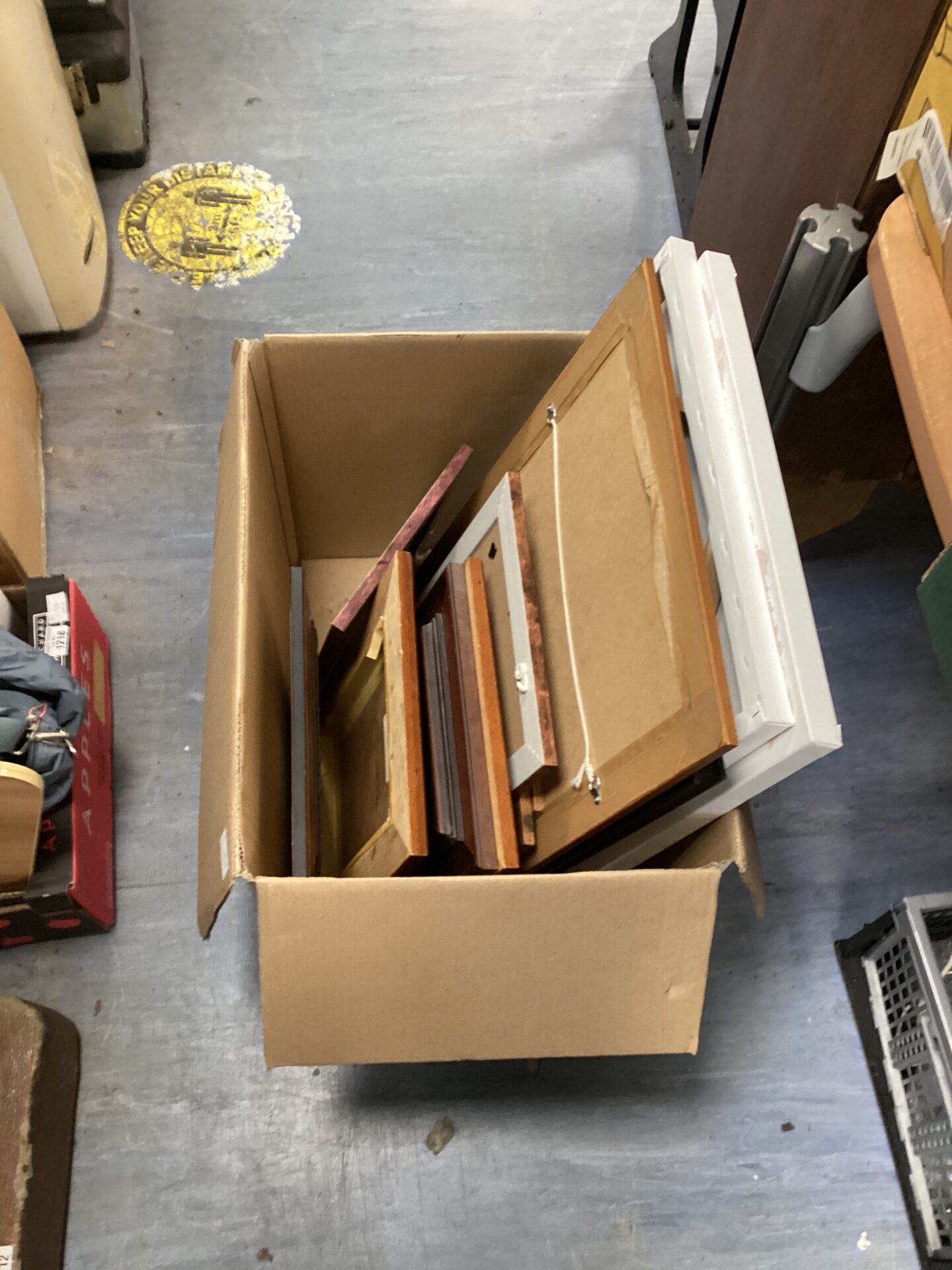 This lot contains a collection of picture frames and framed art pieces. The frames vary in size, material, and style, suggesting a mix of vintage and contemporary pieces. The assortment includes both empty frames ready for new artwork and pieces already displaying prints or photographs, offering versatility for display or repurposing.