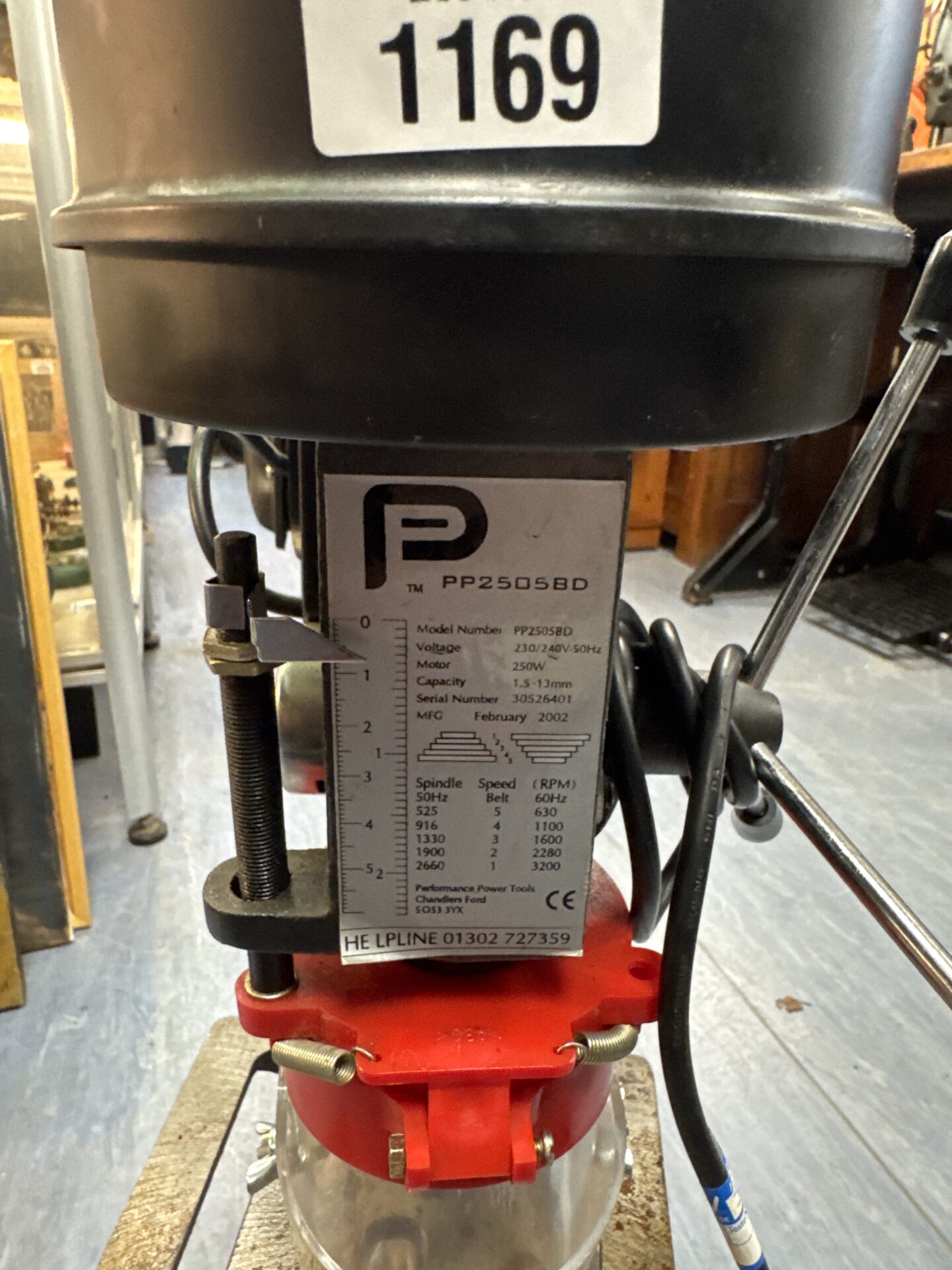 This is a Performance Pro pillar drill, a compact bench-mounted drill press suitable for light metalworking and DIY tasks. The drill features a tilting work table for angled drilling and a depth stop for consistent hole depths. It is a practical addition to any workshop or home enthusiast’s toolkit.