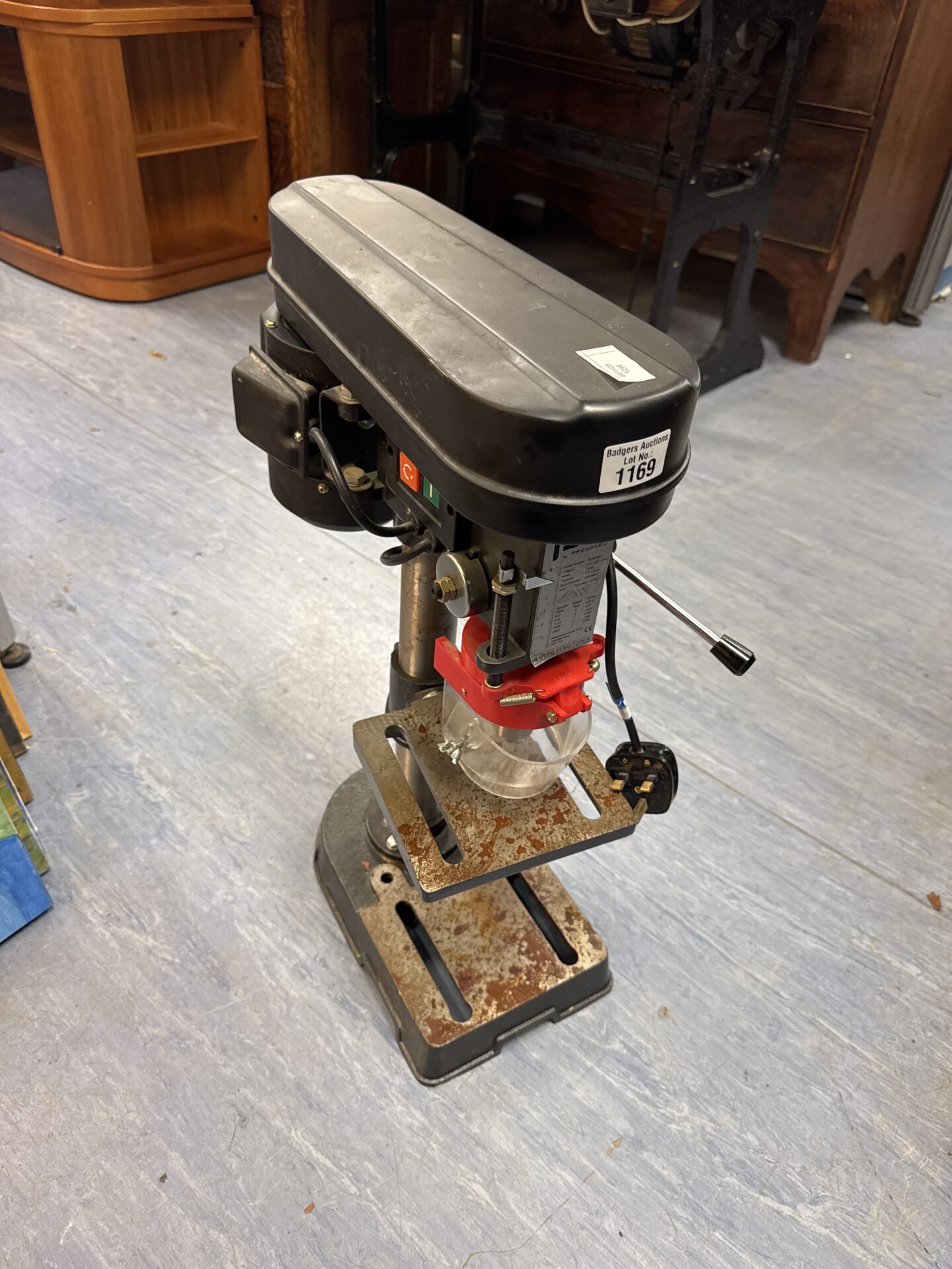 This pillar drill shows signs of previous use and wear, consistent with its age and function. The drill powers on, but its full operational status is unknown. It may appeal to collectors of vintage tools or those seeking a project to restore, or a functional drill for light-duty tasks.
