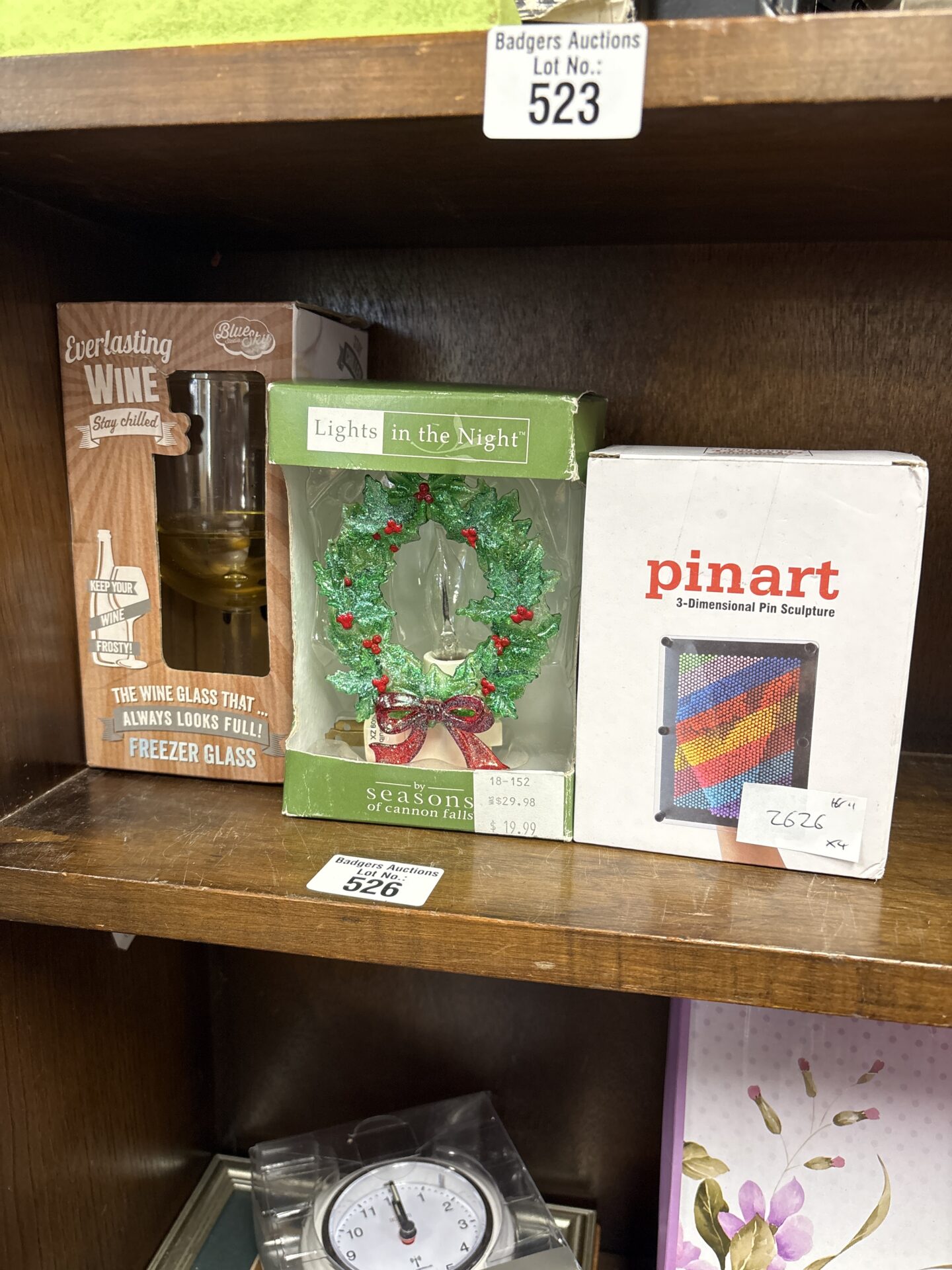 This is a Pinart 3-dimensional sculpture, featuring a novelty wine glass design and a light-up Christmas ornament. The sculpture is constructed with pins that create an impression when pressure is applied, allowing for a unique interactive experience. It’s a playful and visually interesting piece, designed to add a touch of whimsy to any space.
