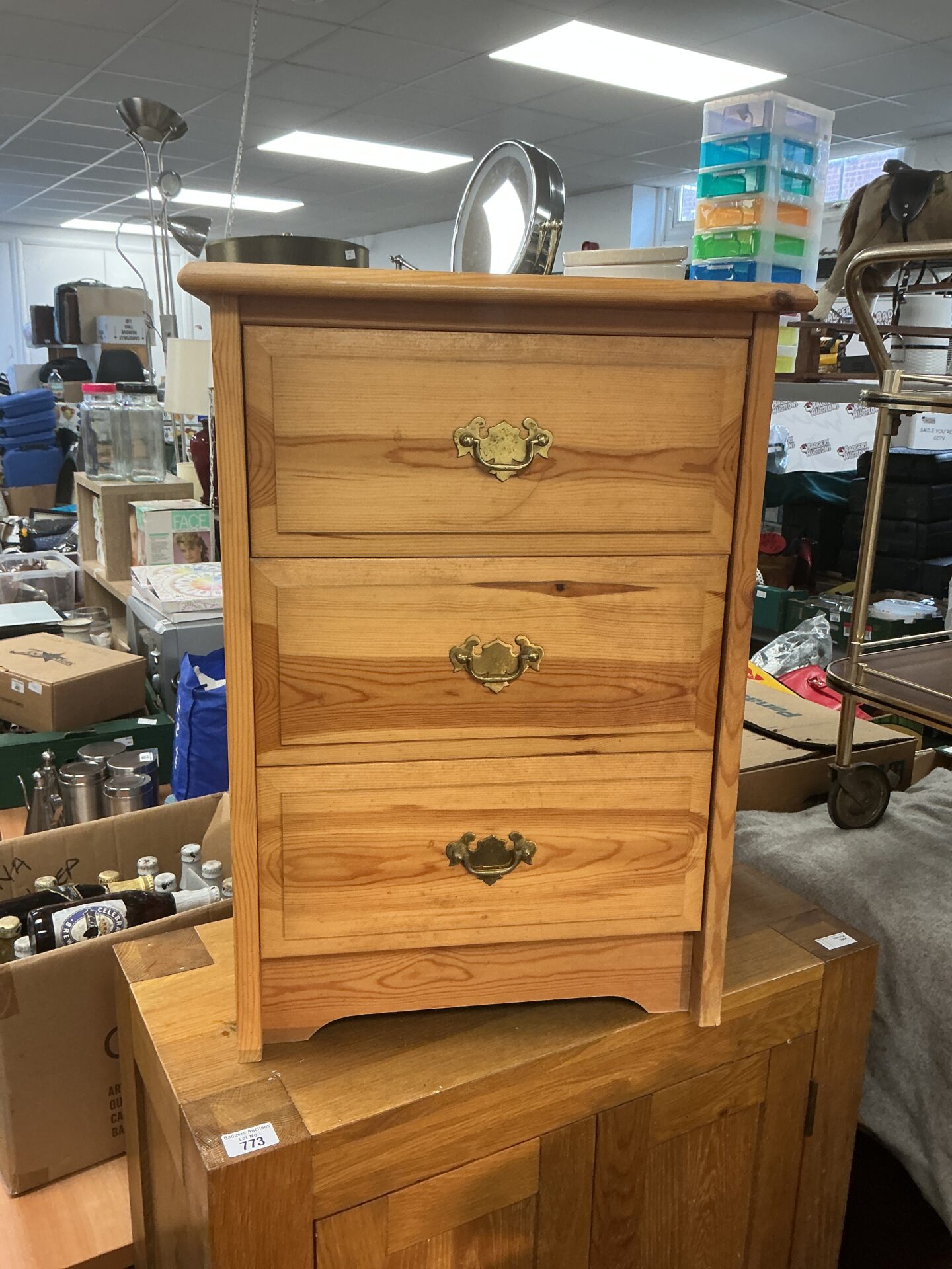 This is a charming pine bedside cabinet featuring three drawers, ideal for bedroom storage. Constructed from solid pine, it exhibits a classic country style, offering a warm and inviting aesthetic. The cabinet measures 17”x14”x25”, making it a compact yet functional addition to any bedroom space.