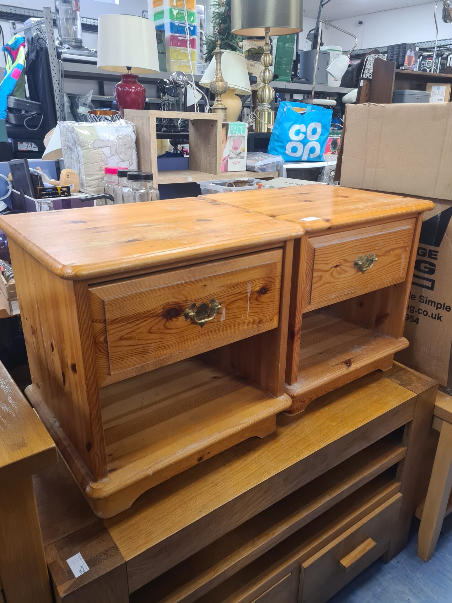 This pair of bedside cabinets are crafted from pine, offering a rustic aesthetic. Each cabinet features a single drawer and a cupboard below, providing practical storage. The cabinets have brass handles, adding a touch of warmth and character to their design.