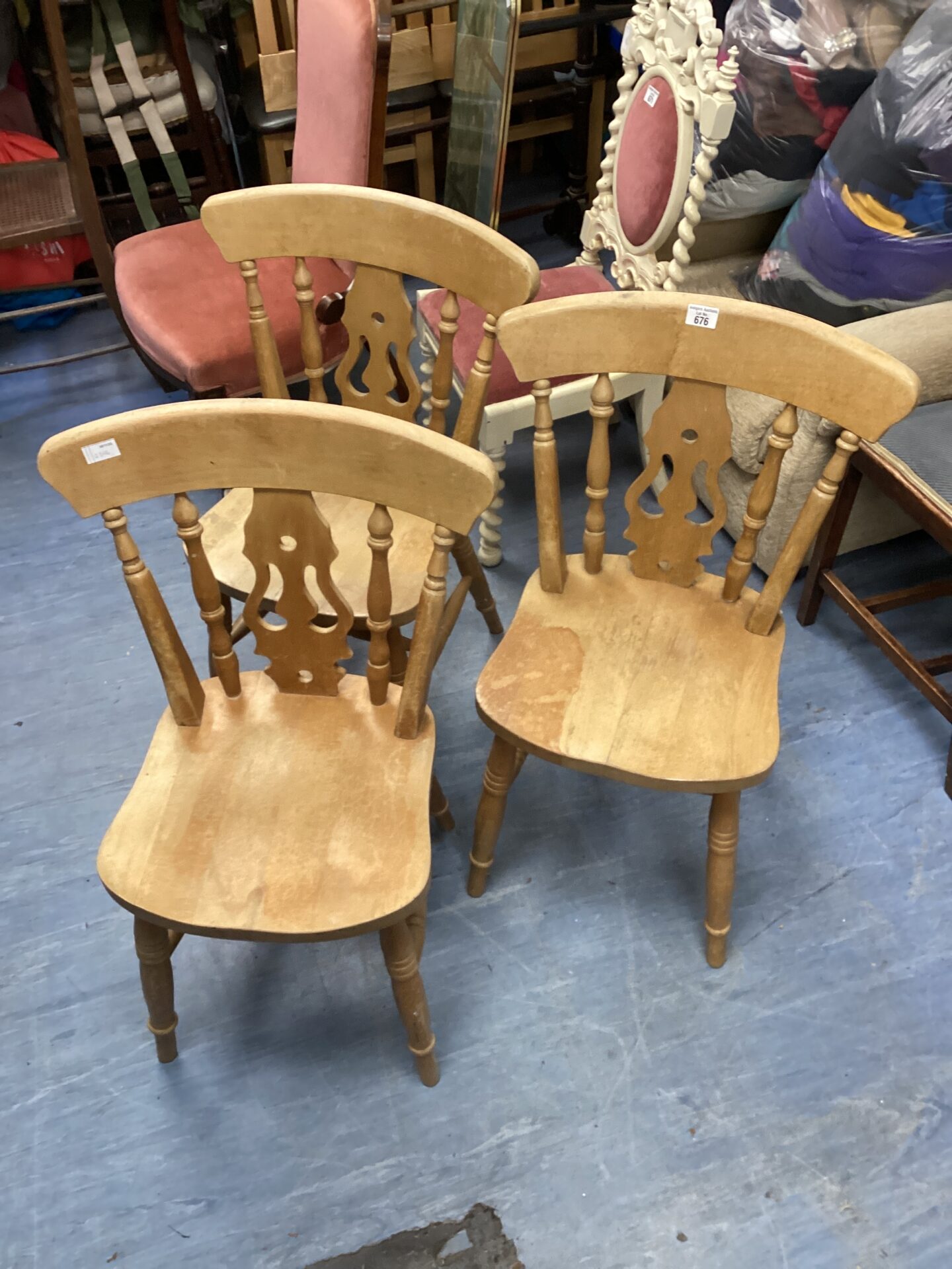 This lot comprises three charming pine chairs, exhibiting a classic farmhouse aesthetic. The chairs feature gently curved back splats and solid construction, typical of country furniture. Their simple yet elegant design would suit a variety of interior styles, from rustic kitchens to cosy dining spaces.