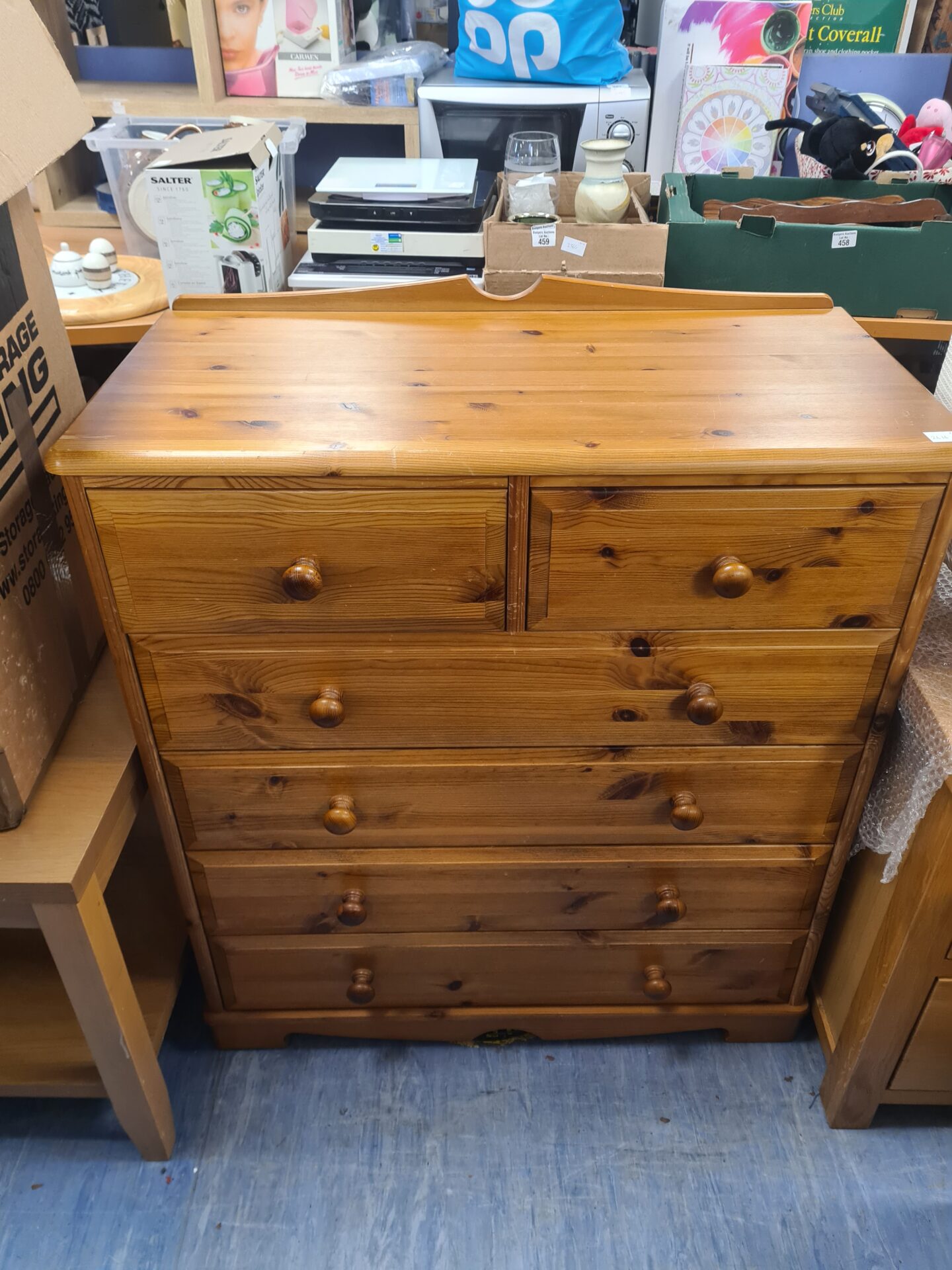 This pine chest of drawers features a classic two-over-four drawer design, perfect for bedroom storage. It shows signs of wear consistent with age, adding to its vintage charm. A solid and characterful piece for those seeking rustic or farmhouse style.