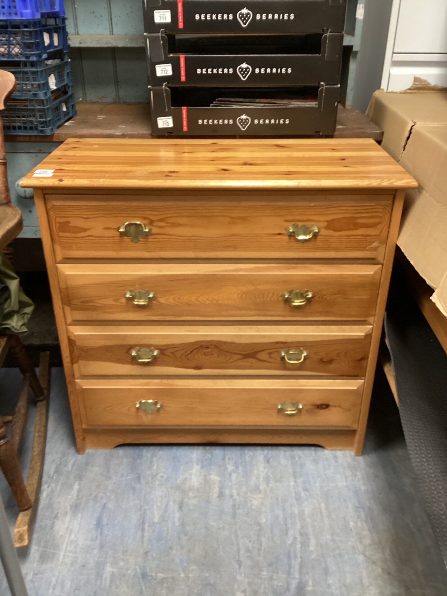This is a four-drawer chest of drawers constructed from pine. The piece exhibits a simple, classic design, typical of country or cottage style furniture. The drawers are smooth running and the piece offers practical storage for a bedroom or other living space.