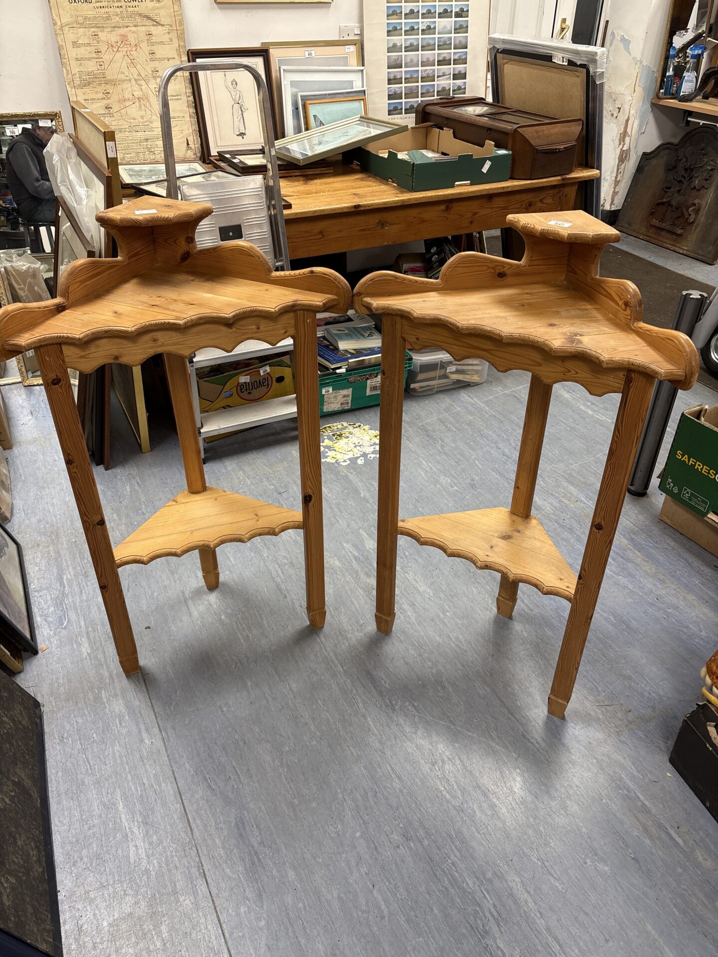 These charming corner units are crafted from pine, featuring a distinctive wave edge detailing to the top surface. The design lends itself to country or cottage style interiors, offering a practical and decorative solution for displaying items or utilising corner space. The units are constructed with a simple, elegant form, showcasing the natural grain of the wood.