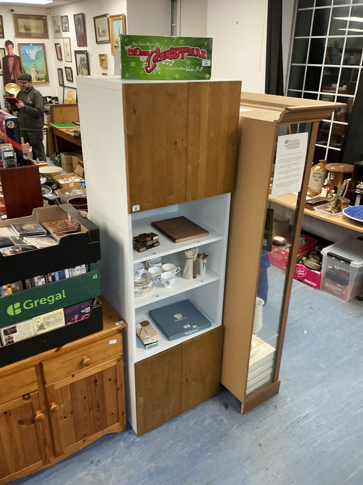 This cupboard and shelf unit shows signs of previous use and may benefit from cleaning or restoration. It presents a good opportunity for a collector of vintage or pine furniture, or for someone seeking a functional and stylish storage solution for their home. The unit’s size and configuration make it suitable for a variety of rooms and purposes.