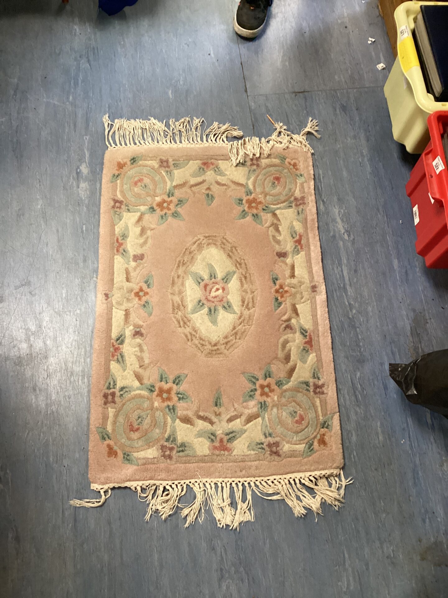 This rug shows signs of wear consistent with age and use. There may be some fading of the colours, minor fraying of the fringes, or slight imperfections in the weave. Despite these imperfections, the rug retains its charm and character, making it a desirable piece for collectors of vintage textiles or those seeking a unique home decor item. The floral design and pink colour palette add to its appeal.