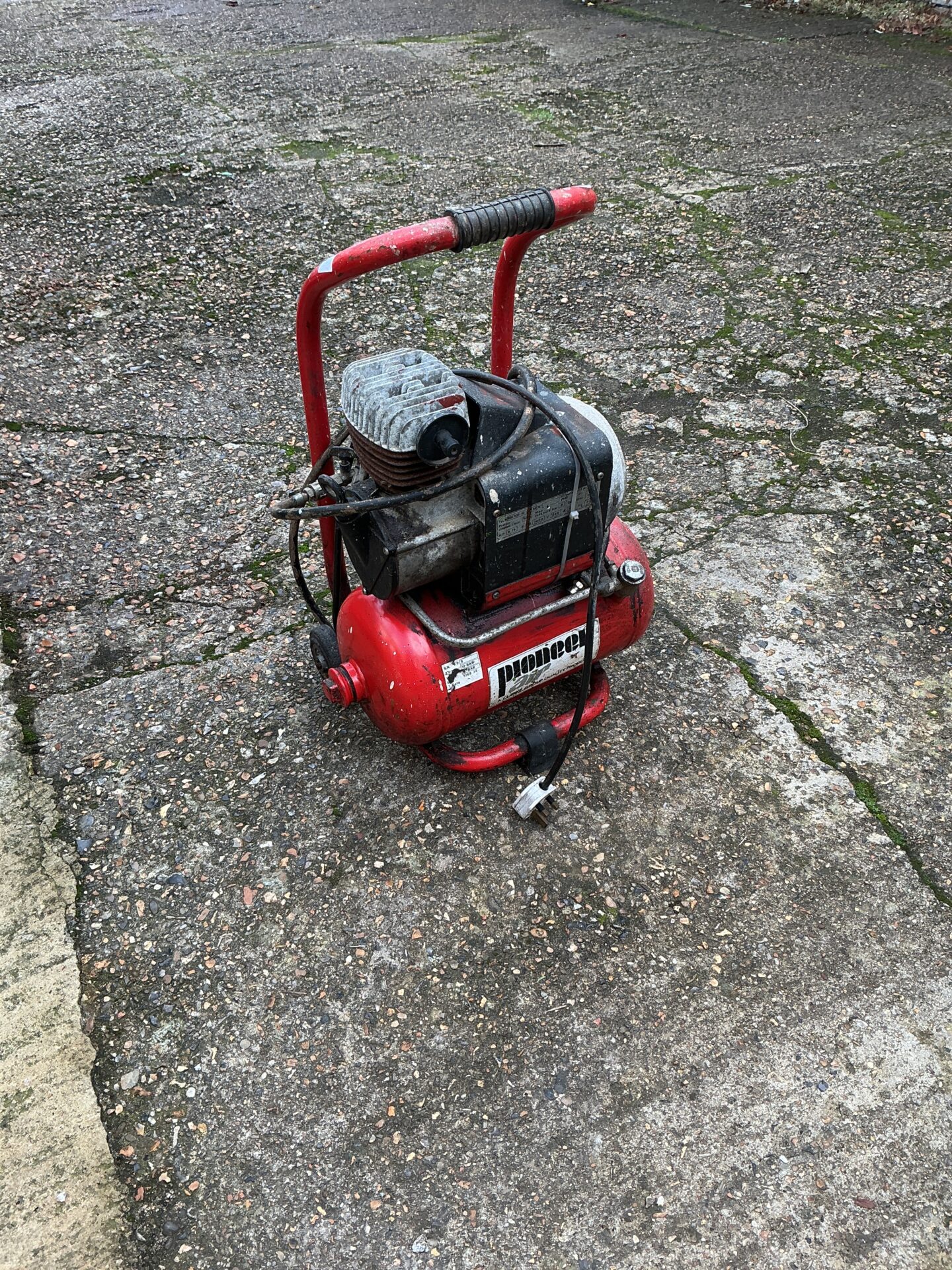 This Pioneer air compressor is a portable unit ideal for workshop or garage use. It features a direct-drive motor and compact tank. Offered in used condition as a project or for parts, this compressor may appeal to collectors or those seeking components for restoration.